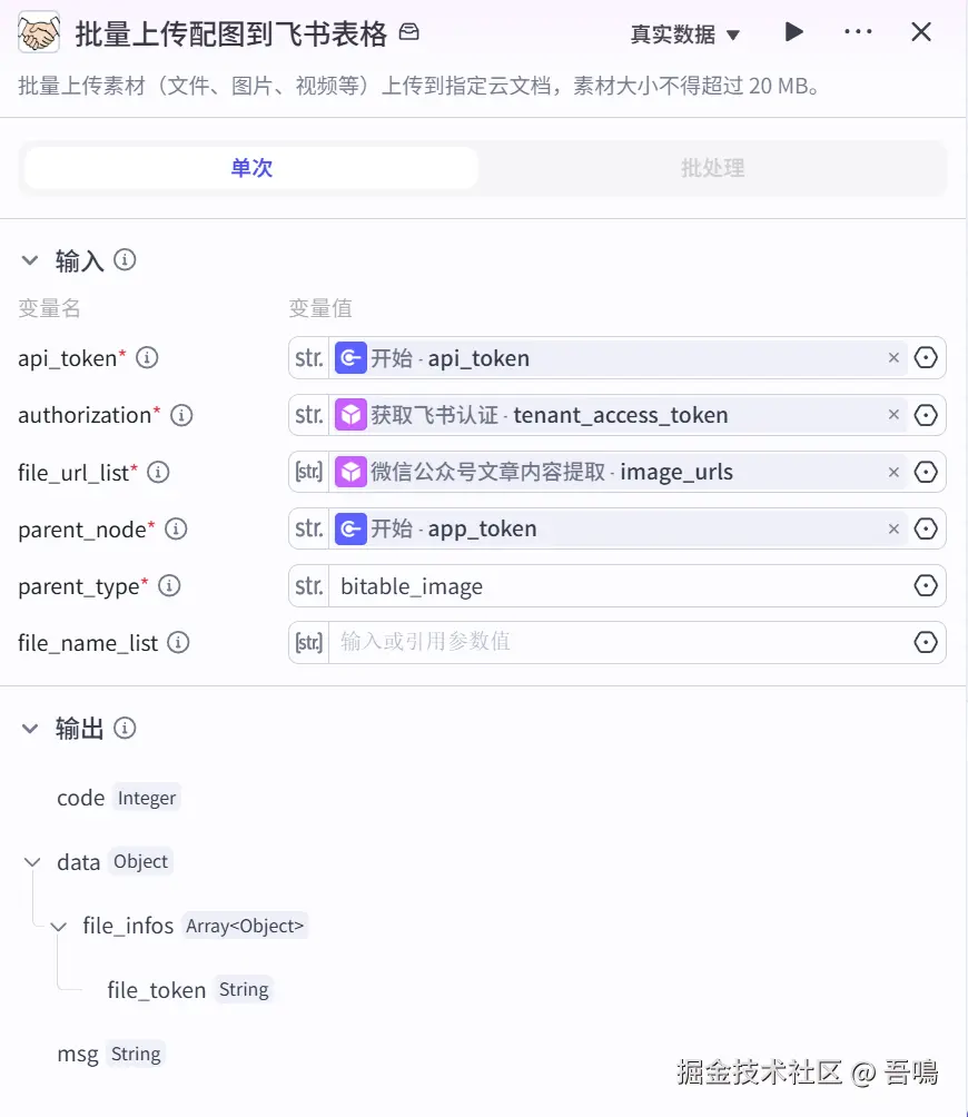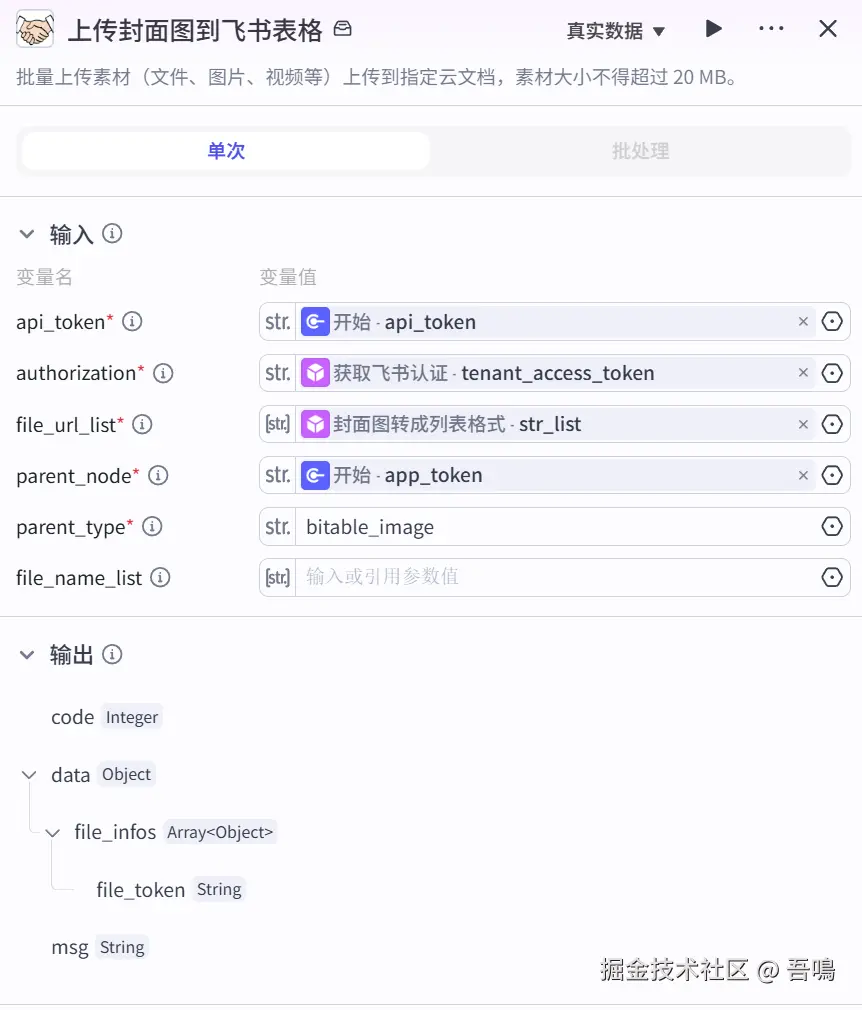 这个节点用来将文章的配图上传到飞书表格,后面的添加附件字段的时候,需要使用到这个节点返回的结果,使用到了扣子三方插件【飞书工具箱】的【batch_upload_medias】工具。