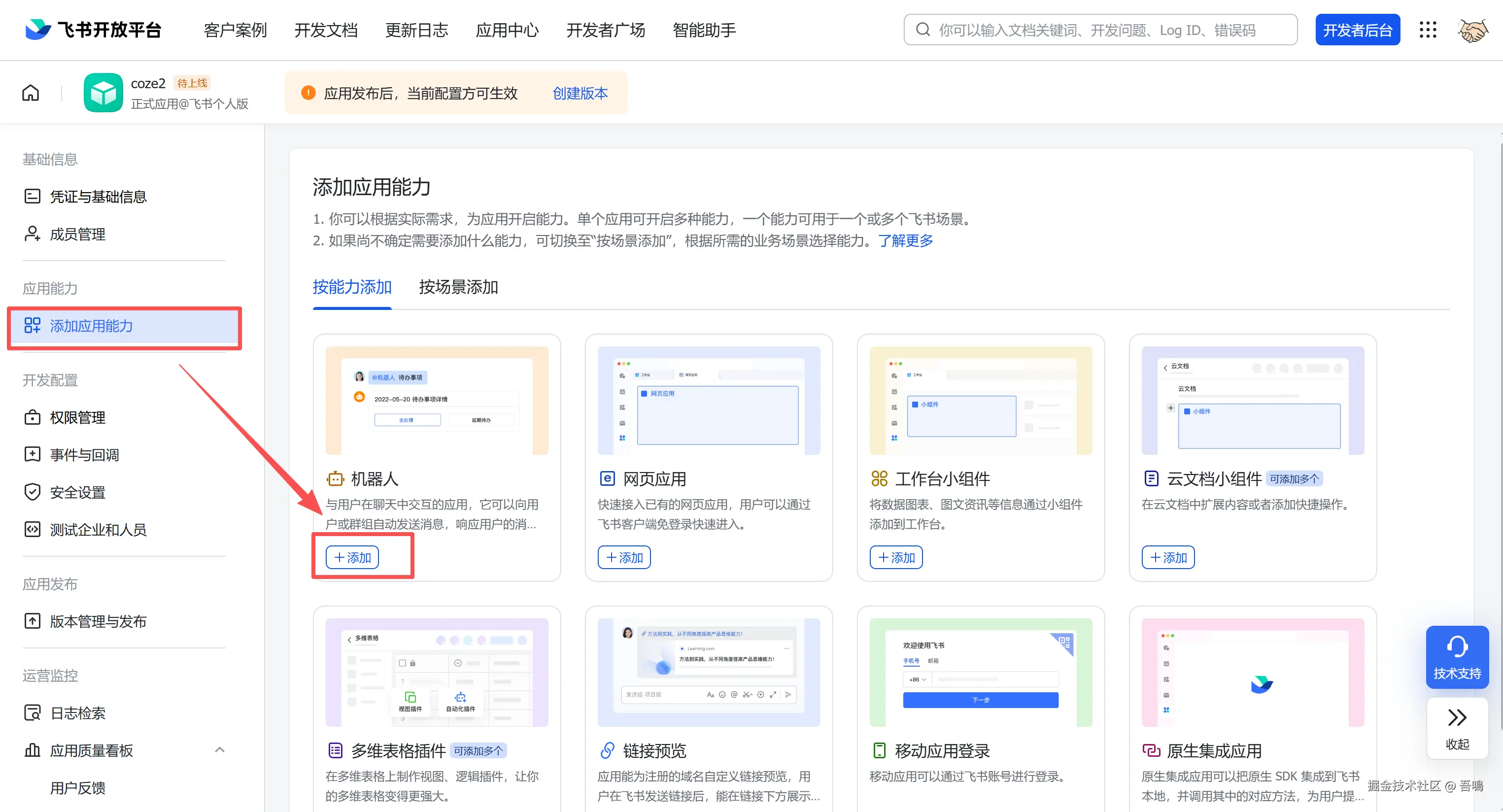 添加应用机器人,需要通过这个机器人来给飞书多维表格授权,点击左侧菜单栏的“添加应用能力”菜单,点击添加机器人即可。
