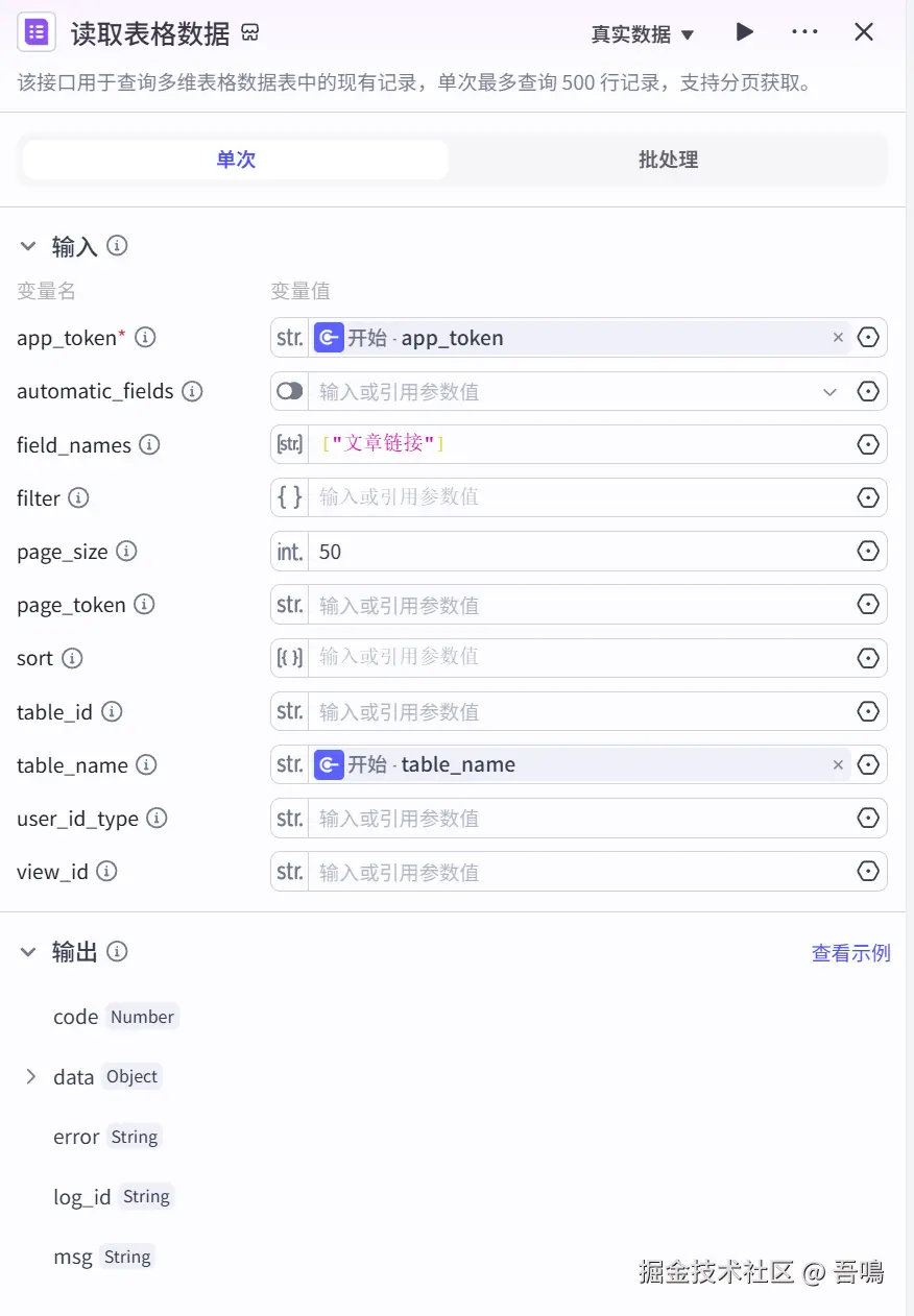 这个节点的作用是用来读取飞书表格的数据,目的就是将文章的链接给读取出来,使用到了官方的插件【飞书多维表格】的search_record工具。