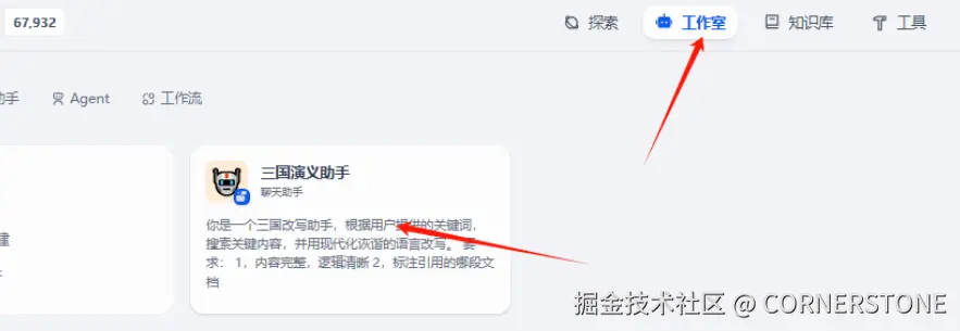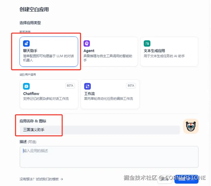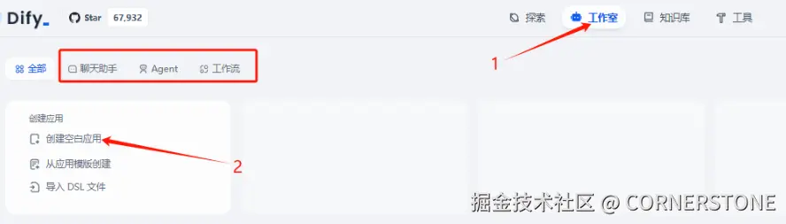 点击工作室,我们可以看到有很多丰富的应用,包括聊天助手、agent、工作流等我们选择最简单的应用,聊天助手,点击5,创建空白应用