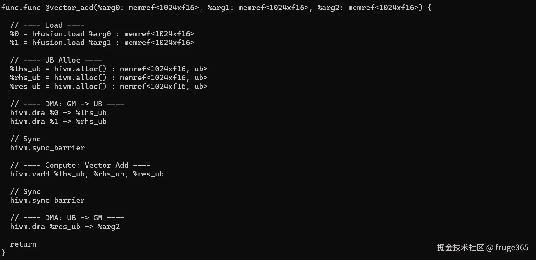 我们以一个向量加法为例,展示如何将 HFusion IR 中的 hfusion.add 操作,转换为 HIVM 指令级调度,并充分利用 Unified Buffer (UB) 和 DMA 提升性能。