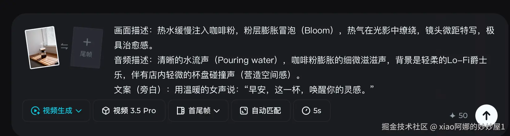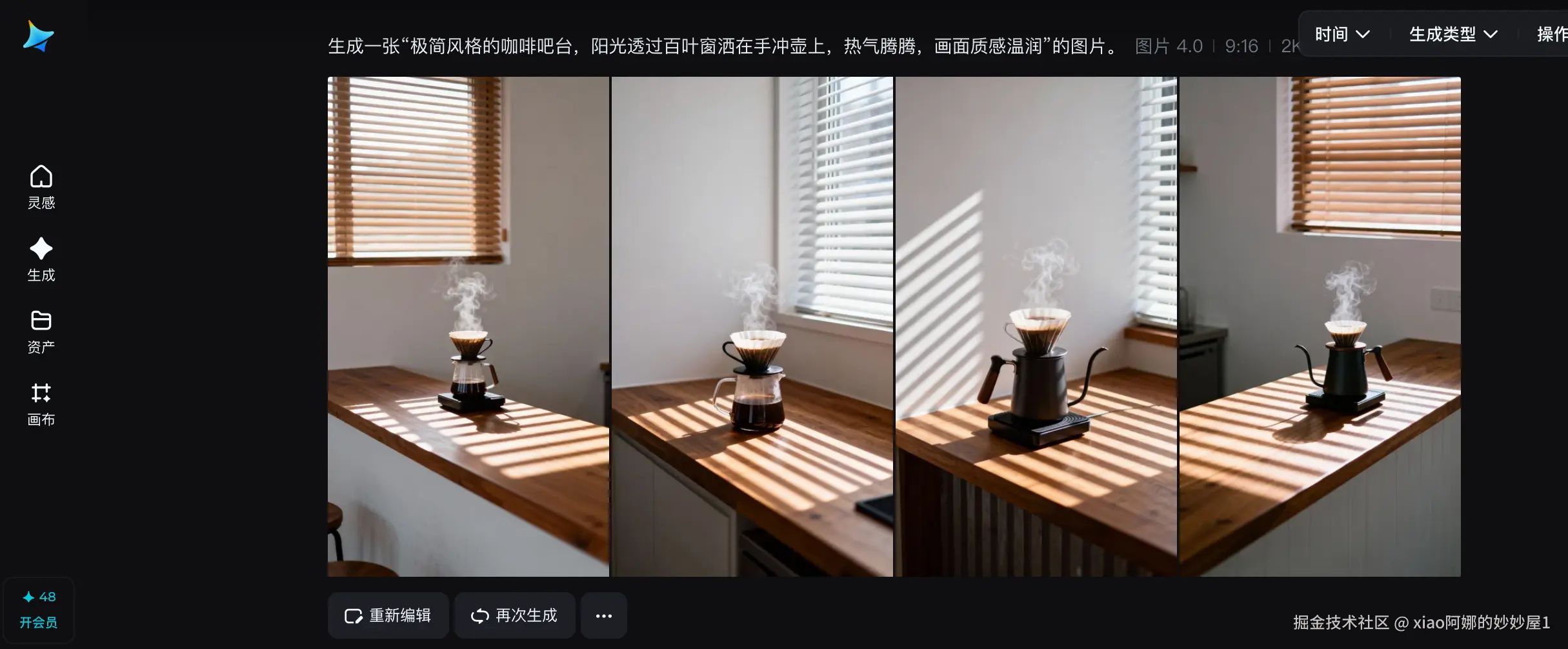- 生图(建立资产):生成一张“极简风格的咖啡吧台,阳光透过百叶窗洒在手冲壶上,热气腾腾,画面质感温润”的图片。