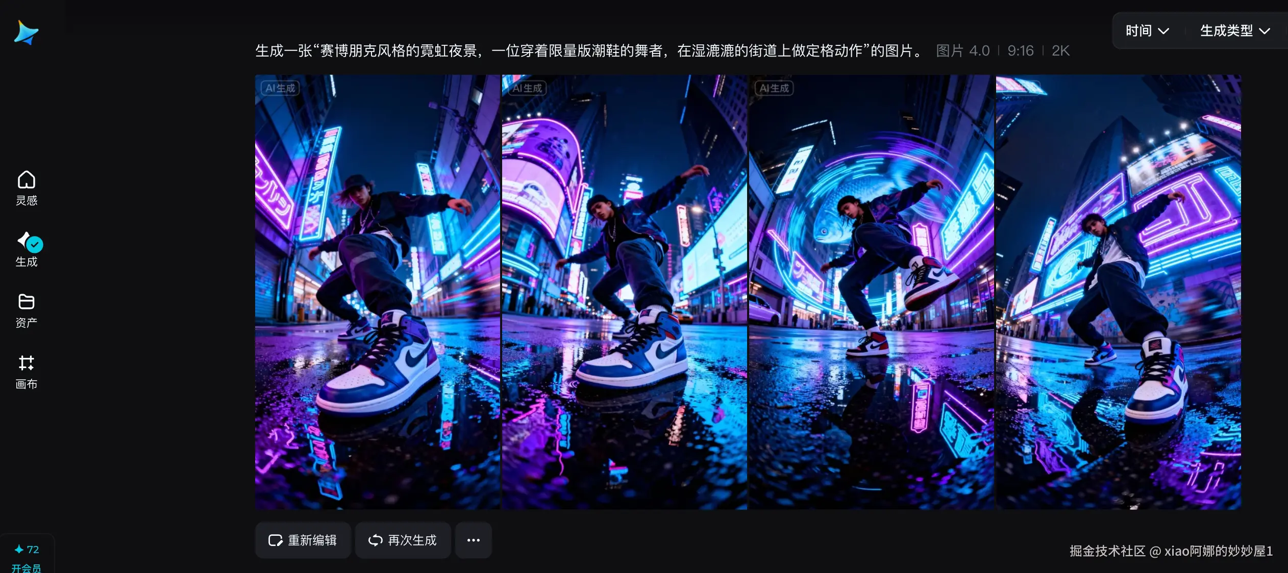 - 生图:生成一张“赛博朋克风格的霓虹夜景,一位穿着限量版潮鞋的舞者,在湿漉漉的街道上做定格动作”的图片。