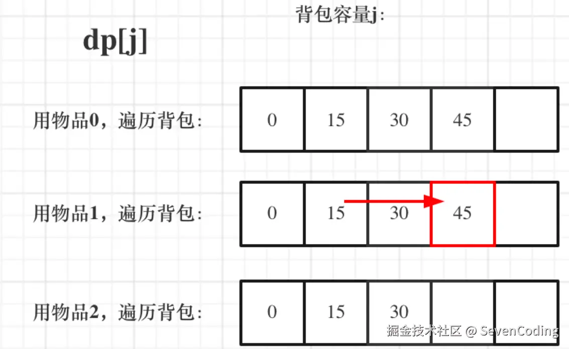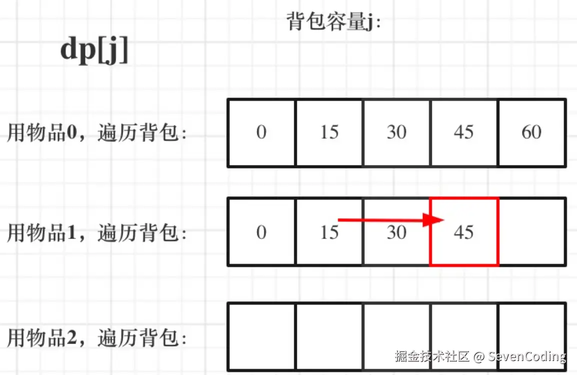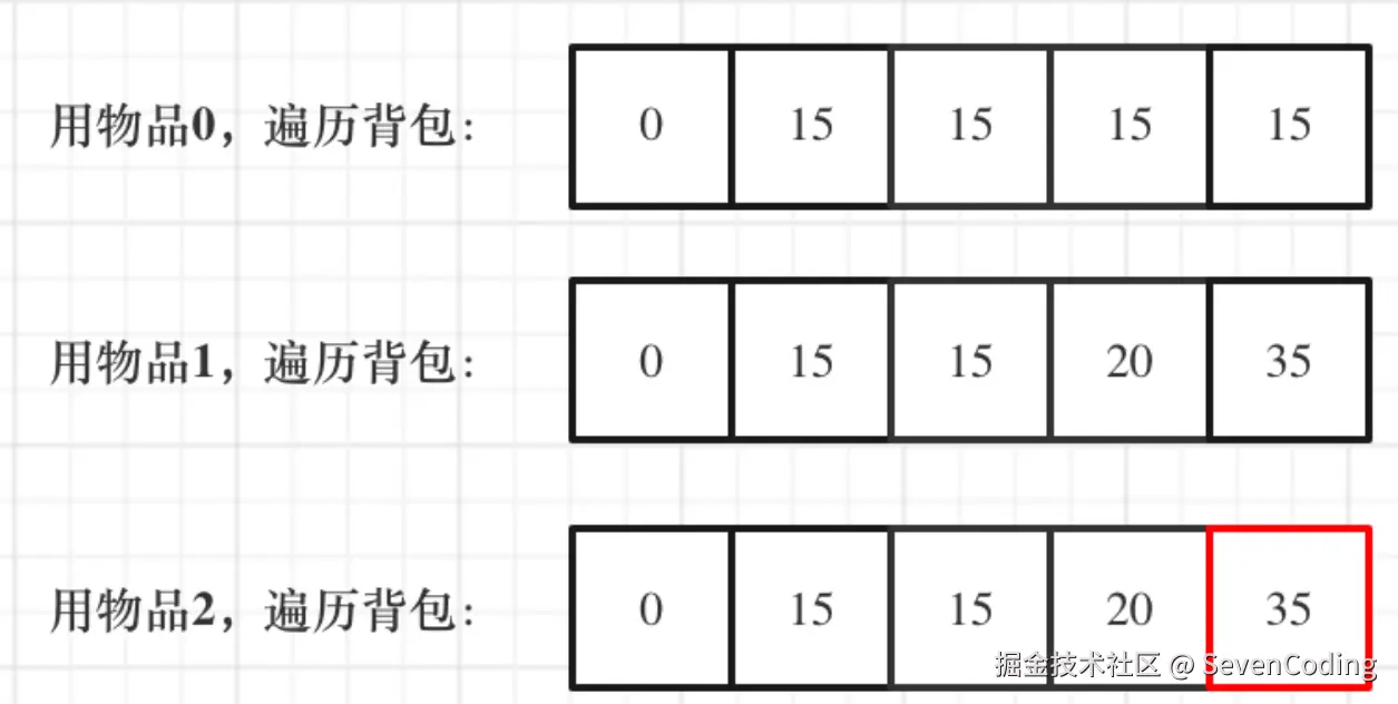 一维dp,分别用物品0,物品1,物品2 来遍历背包,最终得到结果如下: