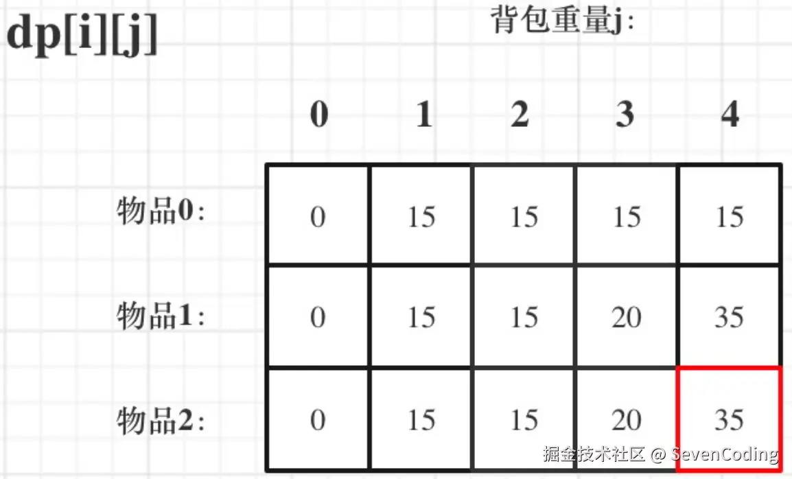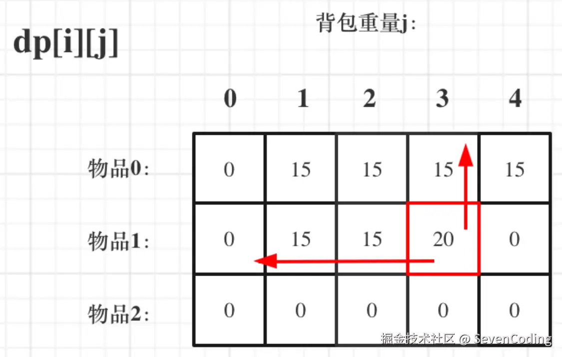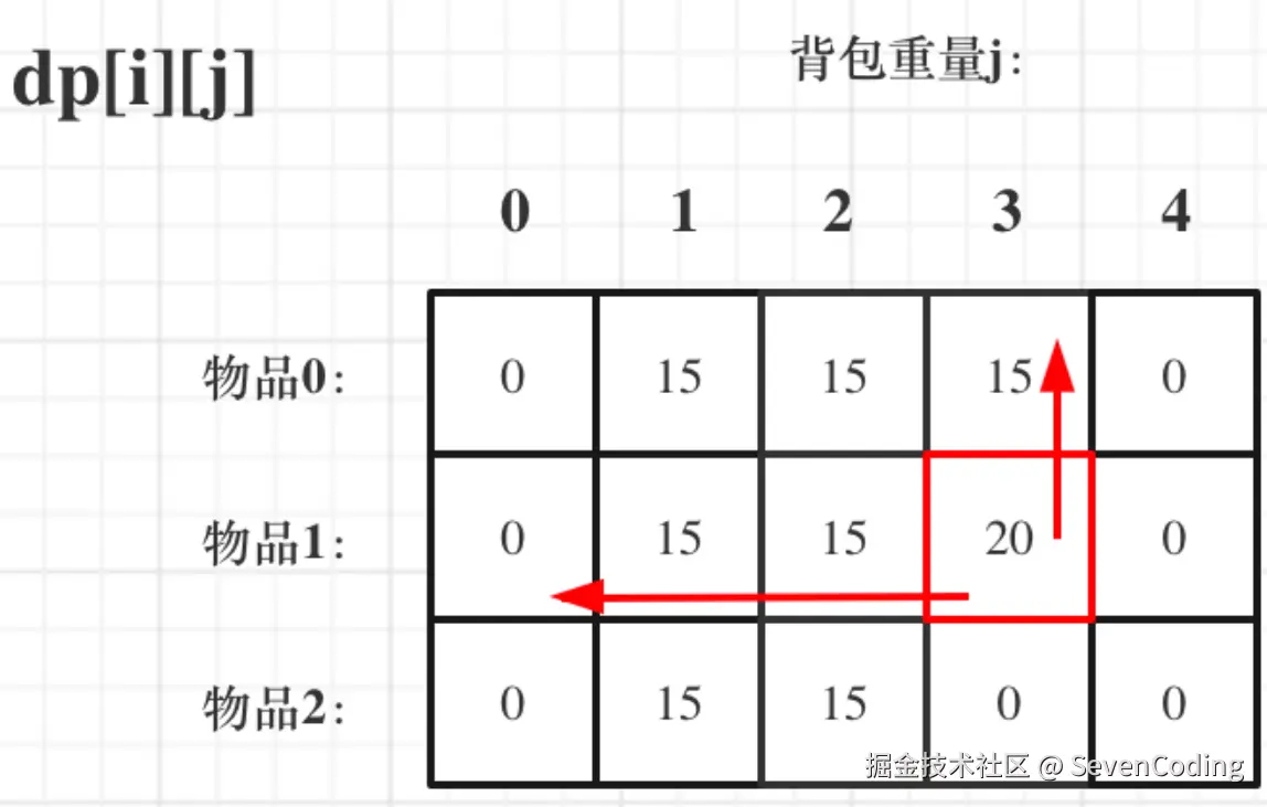 再回顾一下dp[i][j]]的含义:从下标为[0-i]的物品里任意取,放进容量为j的背包,价值总和最大是多少。