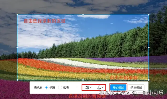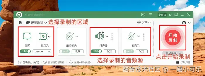 使用方法:选择合适的录制模式,自定义录制范围与音频源,点击 【开始录制】 按钮。