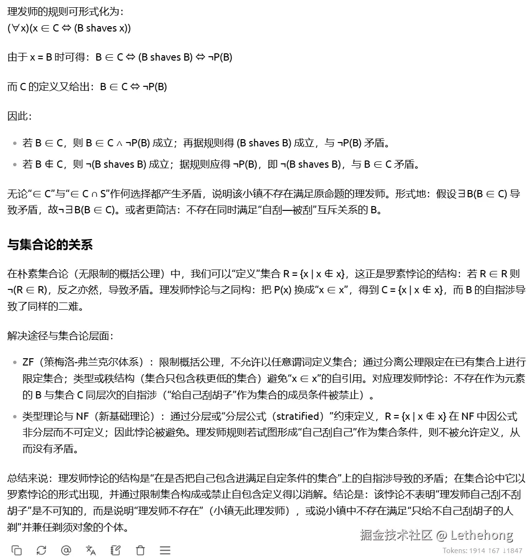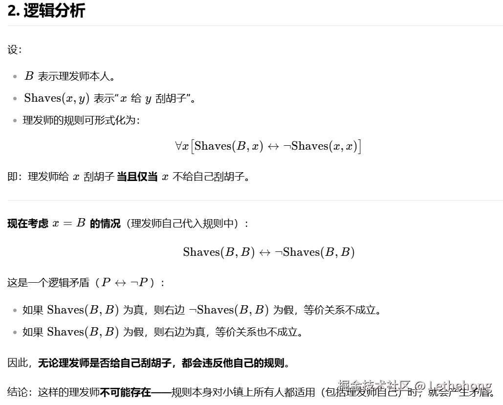 清晰地解释了“理发师悖论”的逻辑矛盾:如果理发师给自己刮胡子,则违反“只给不自己刮胡子的人刮胡子”的规则;如果不给自己刮,则又符合被自己刮的条件,形成循环矛盾。
