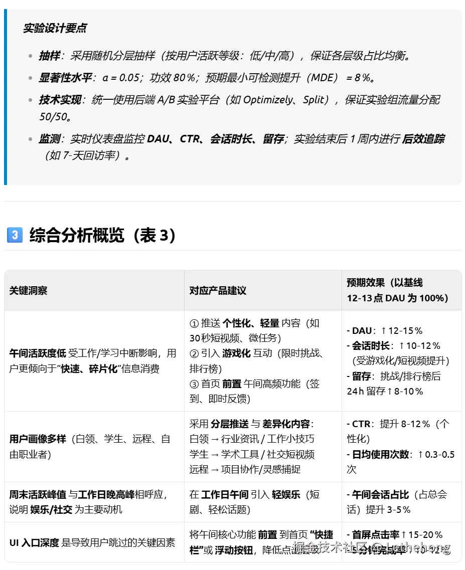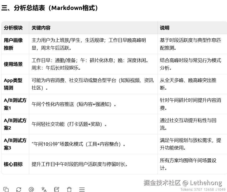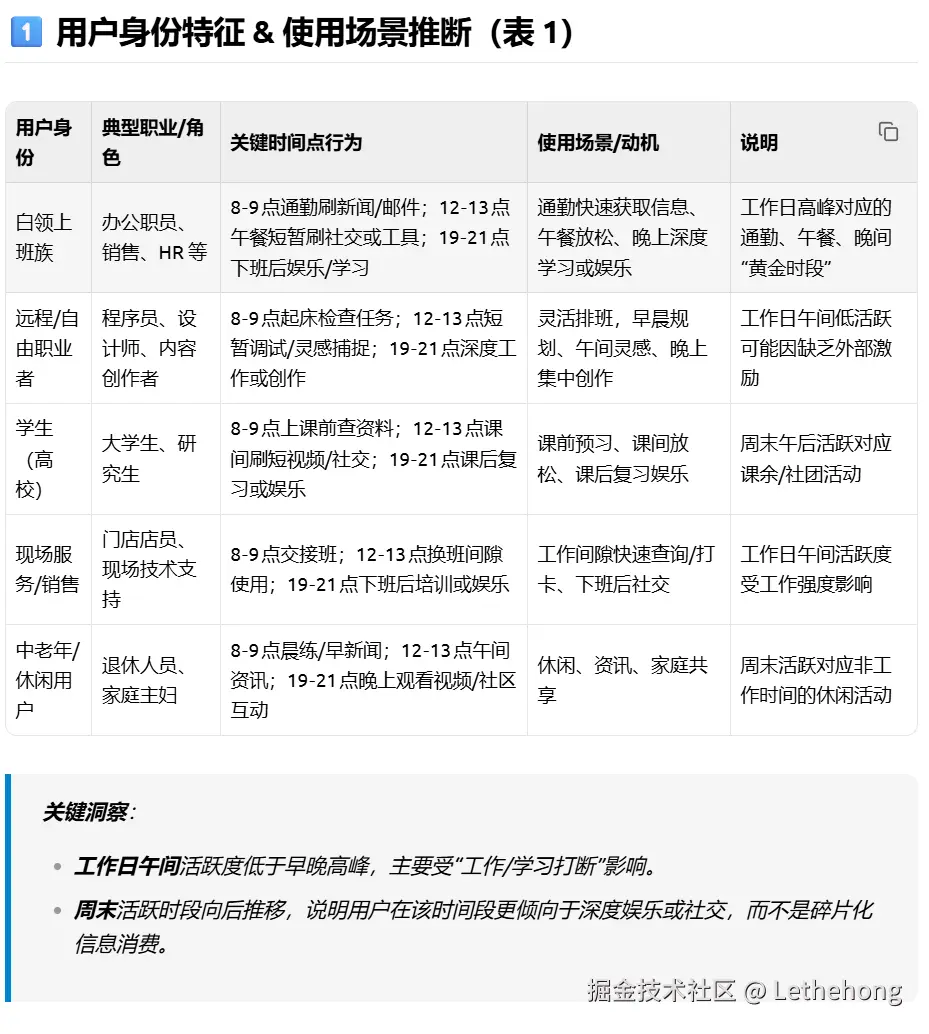 请:1. 推断用户可能的身份特征和使用场景;2. 设计三个A/B测试方案来提升工作日中午的活跃度;3. 以markdown表格形式整理你的分析。”