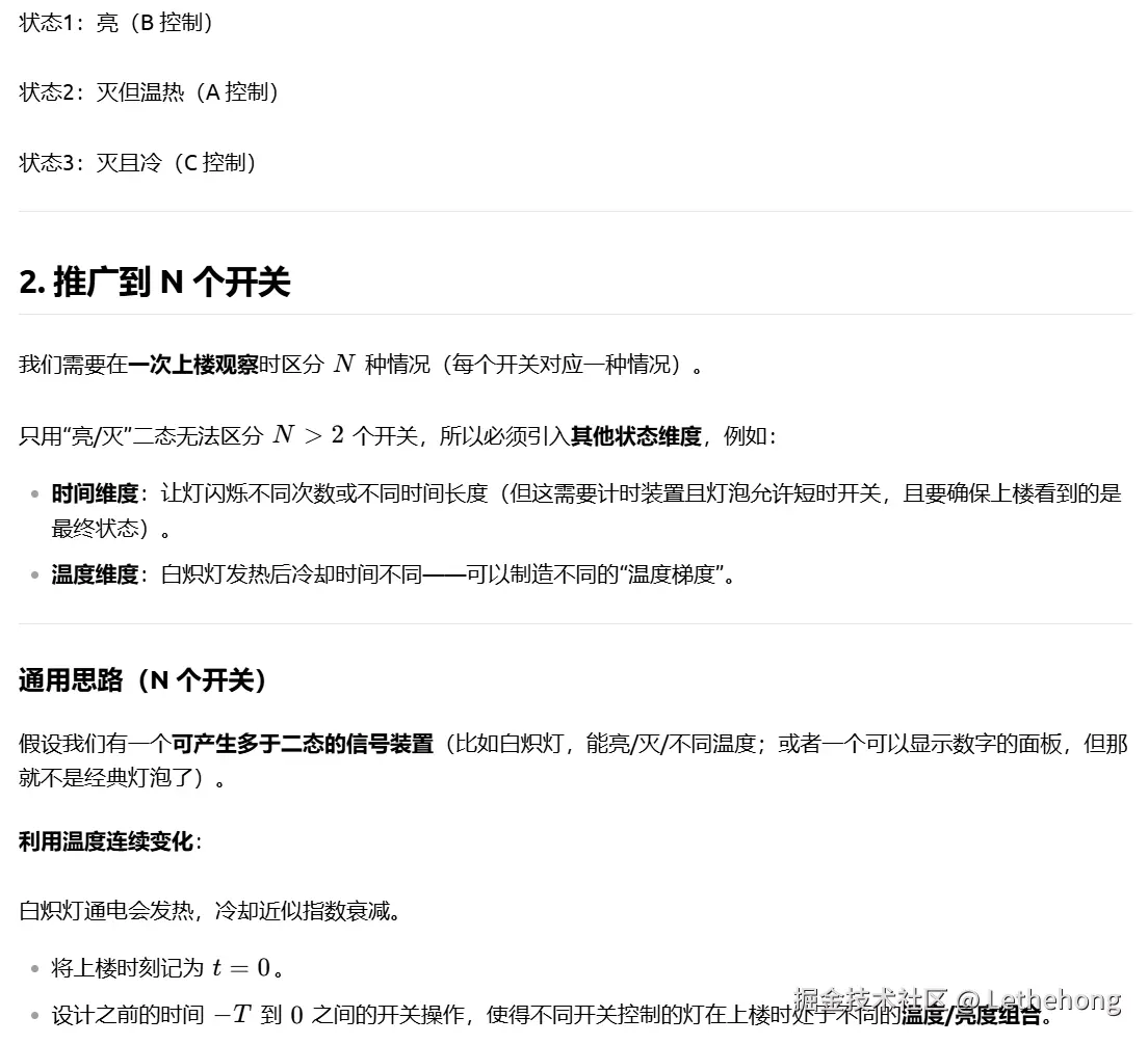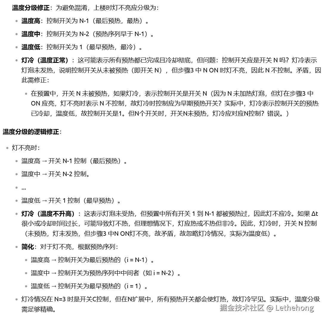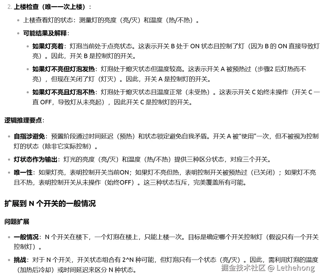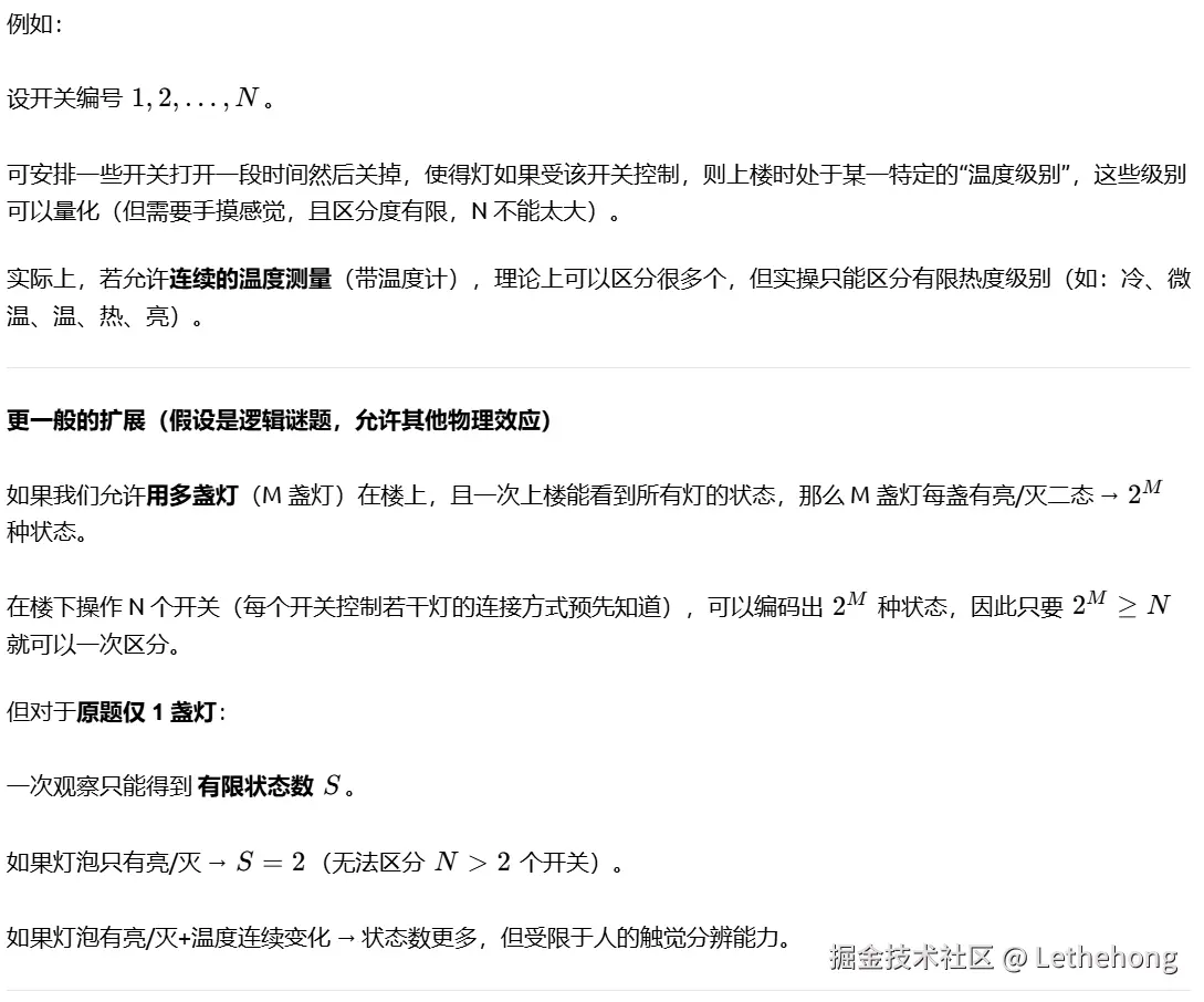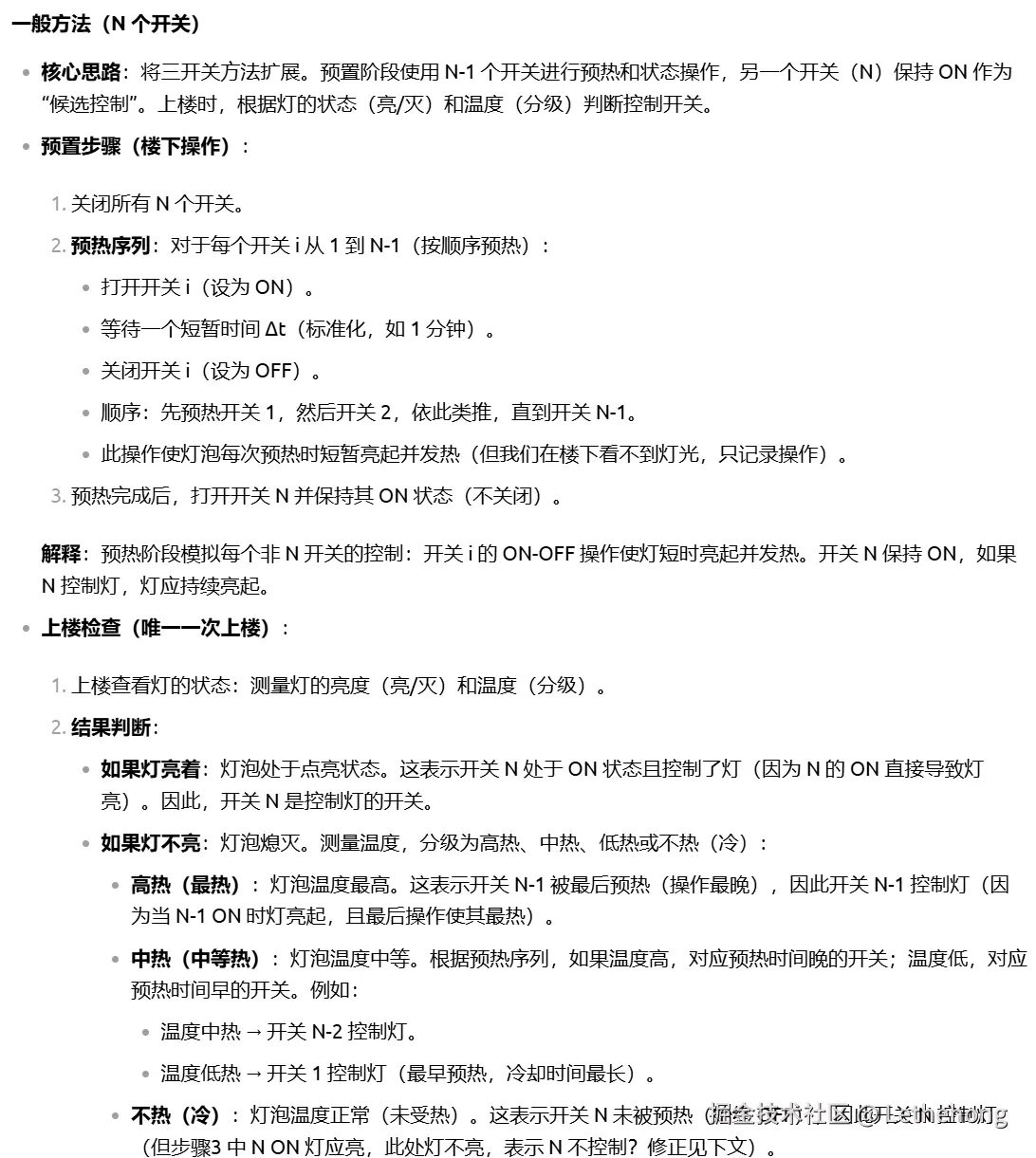 进一步扩展到 N 个开关 的一般情况,提出可通过多重状态组合(如亮/灭/热/冷、闪烁模式、延时电路等)或借助额外工具(如遥控传感器)解决,体现了较强的抽象推广能力。