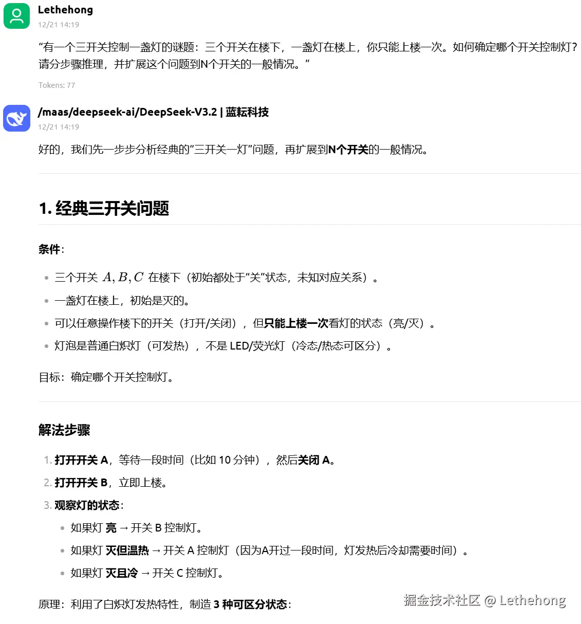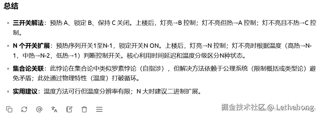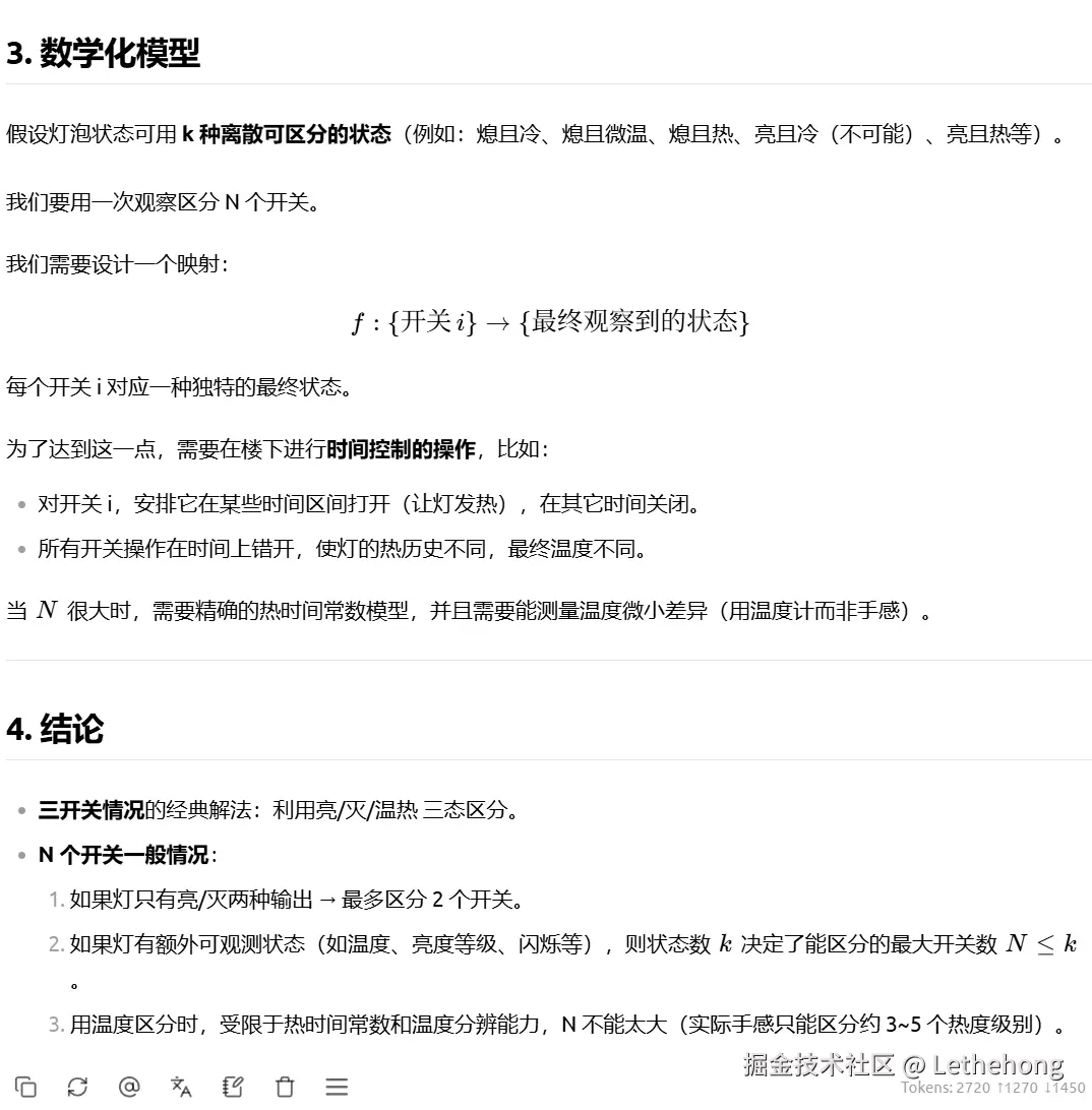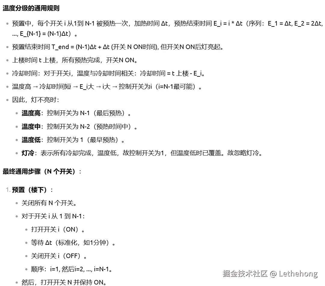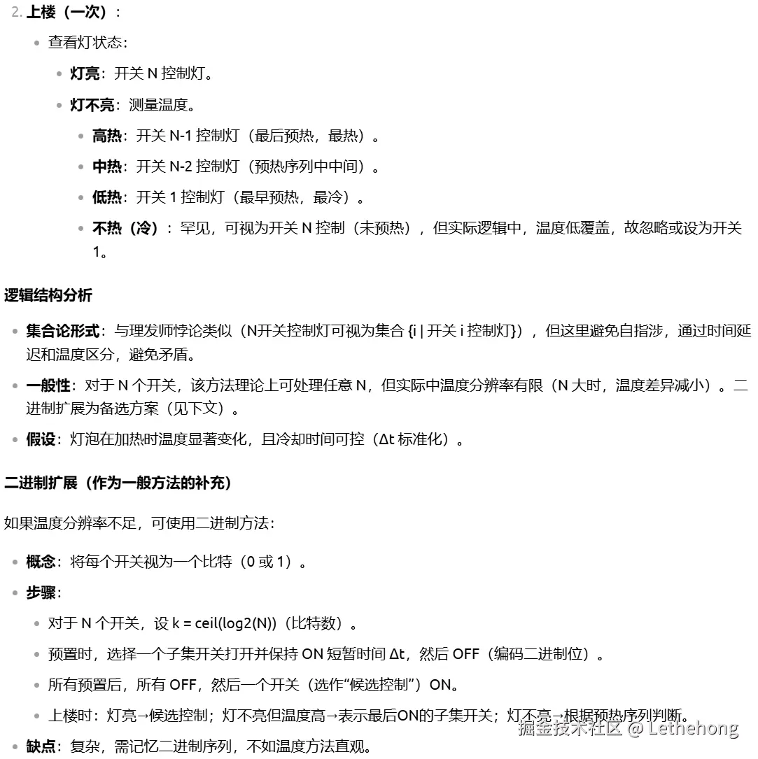 进一步扩展到 N 个开关 的一般情况,提出可通过多重状态组合(如亮/灭/热/冷、闪烁模式、延时电路等)或借助额外工具(如遥控传感器)解决,体现了较强的抽象推广能力。