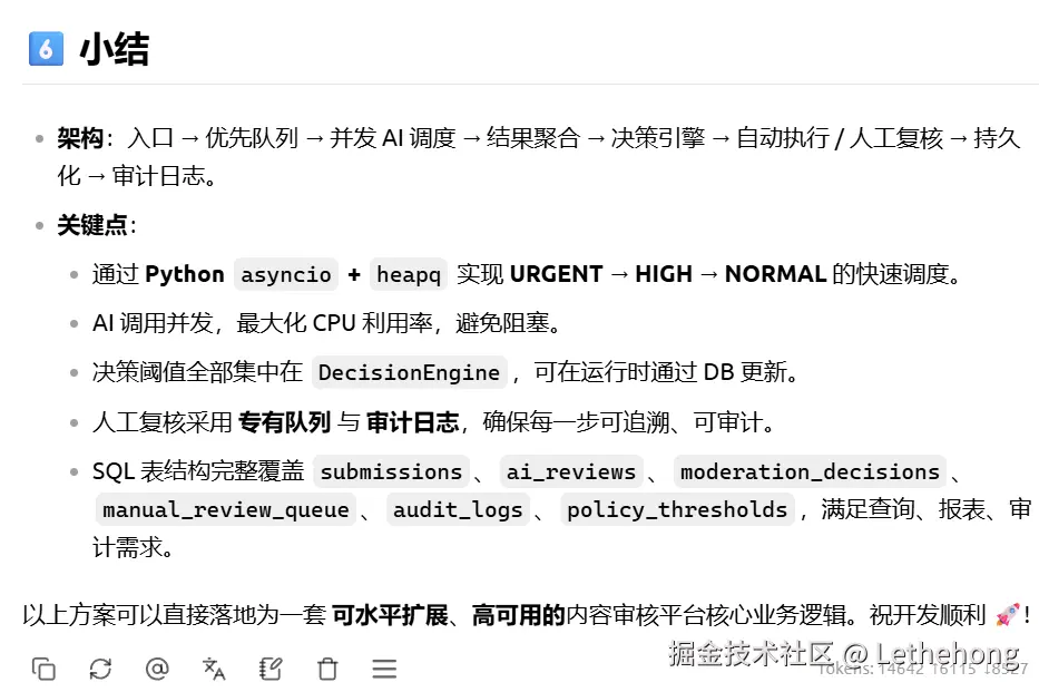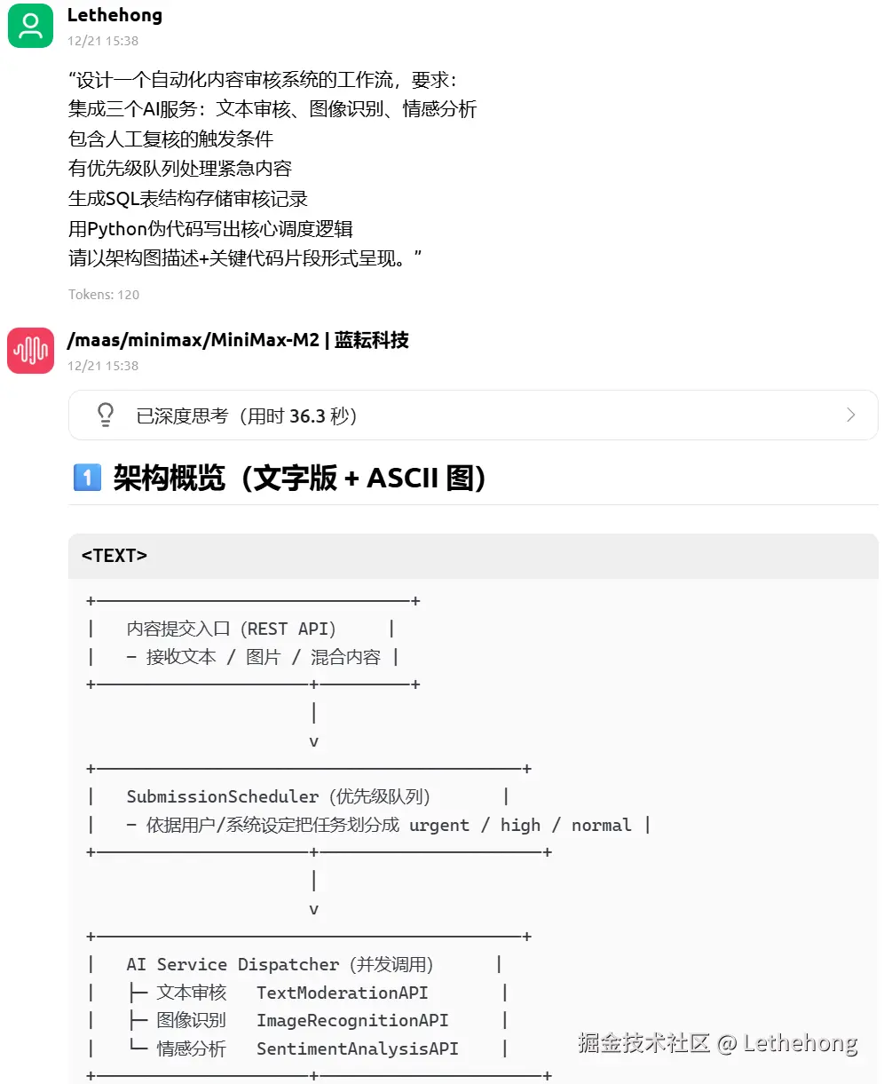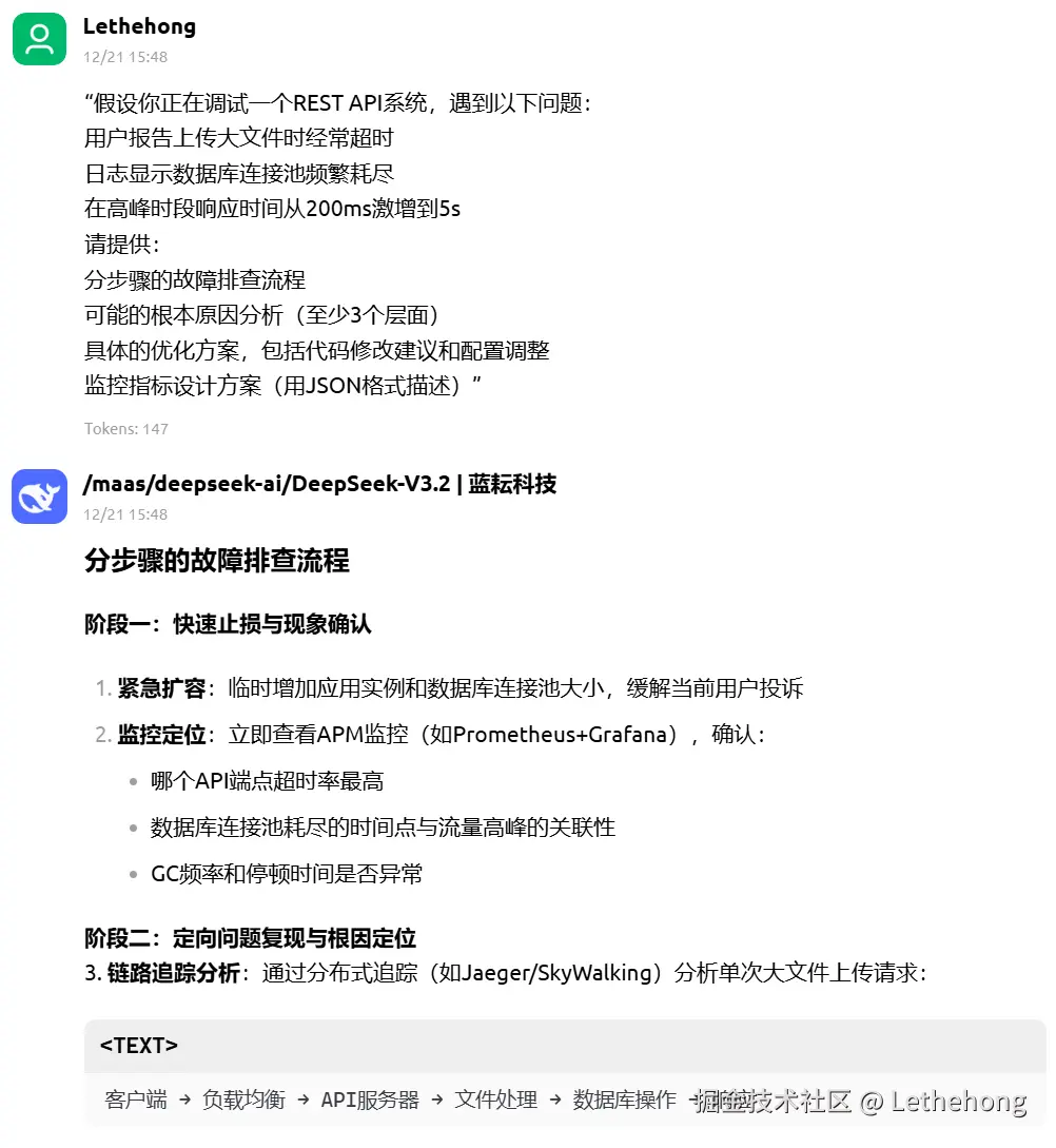 核心差异:DeepSeek‑V3.2在复杂系统设计和故障排查任务中展现出明显的系统工程优势,能够提供深度、结构化、可落地的完整解决方案,特别是在架构设计、代码实现、监控体系建设等方面表现突出。而MiniMax‑M2更侧重于提供基础可行的技术建议,适合快速解决常见问题,但在系统深度和方案完整性上存在差距。