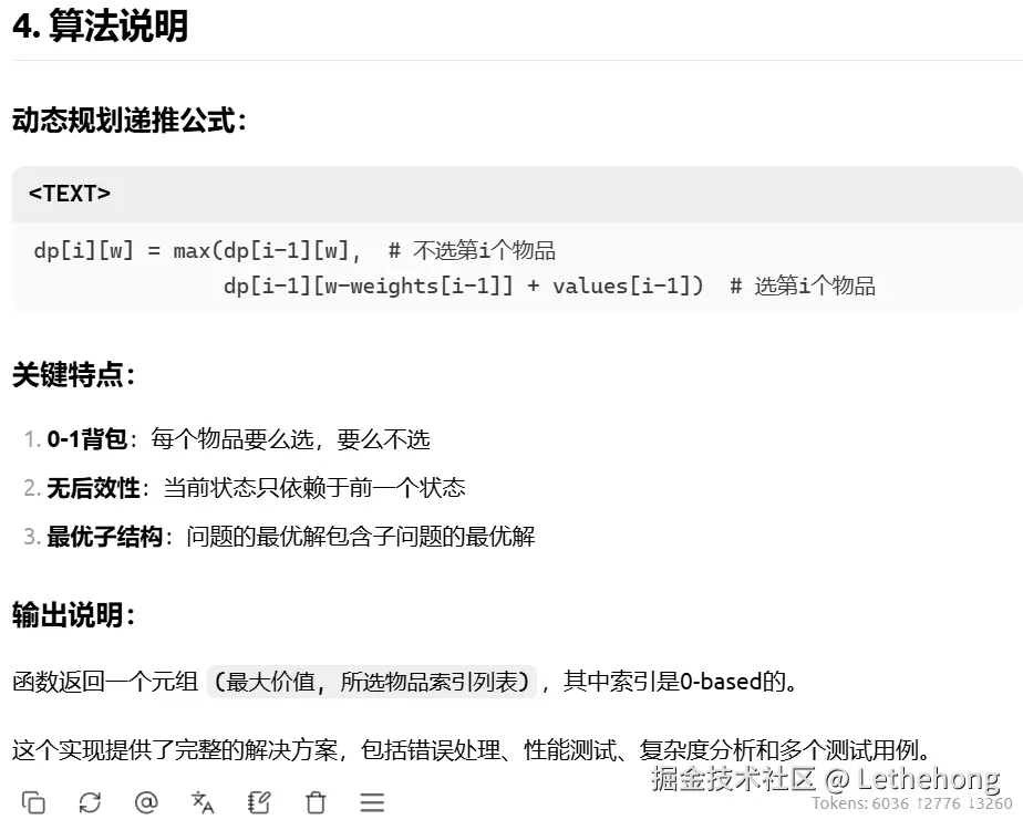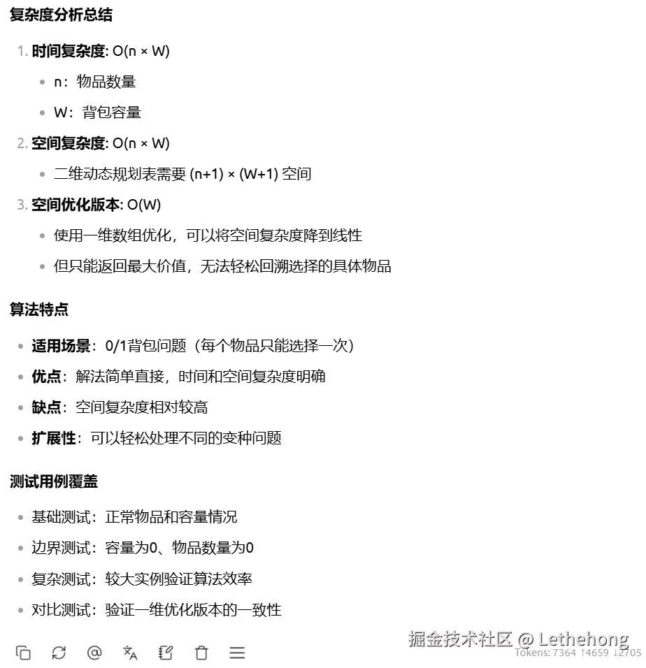 复杂度分析:明确给出时间复杂度O(n×capacity)和空间复杂度O(n×capacity),并提到空间优化版本