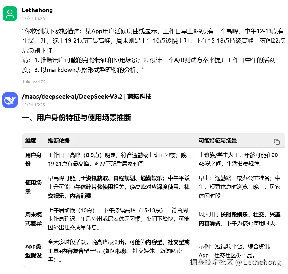 “你收到以下数据描述:某App用户活跃度曲线显示,工作日早上8-9点有一个高峰,中午12-13点有平缓上升,晚上19-21点有最高峰;周末则是上午10点缓慢上升,下午15-18点持续高峰,夜间22点后急剧下降。