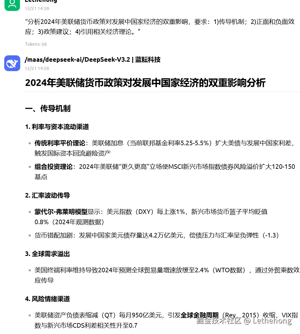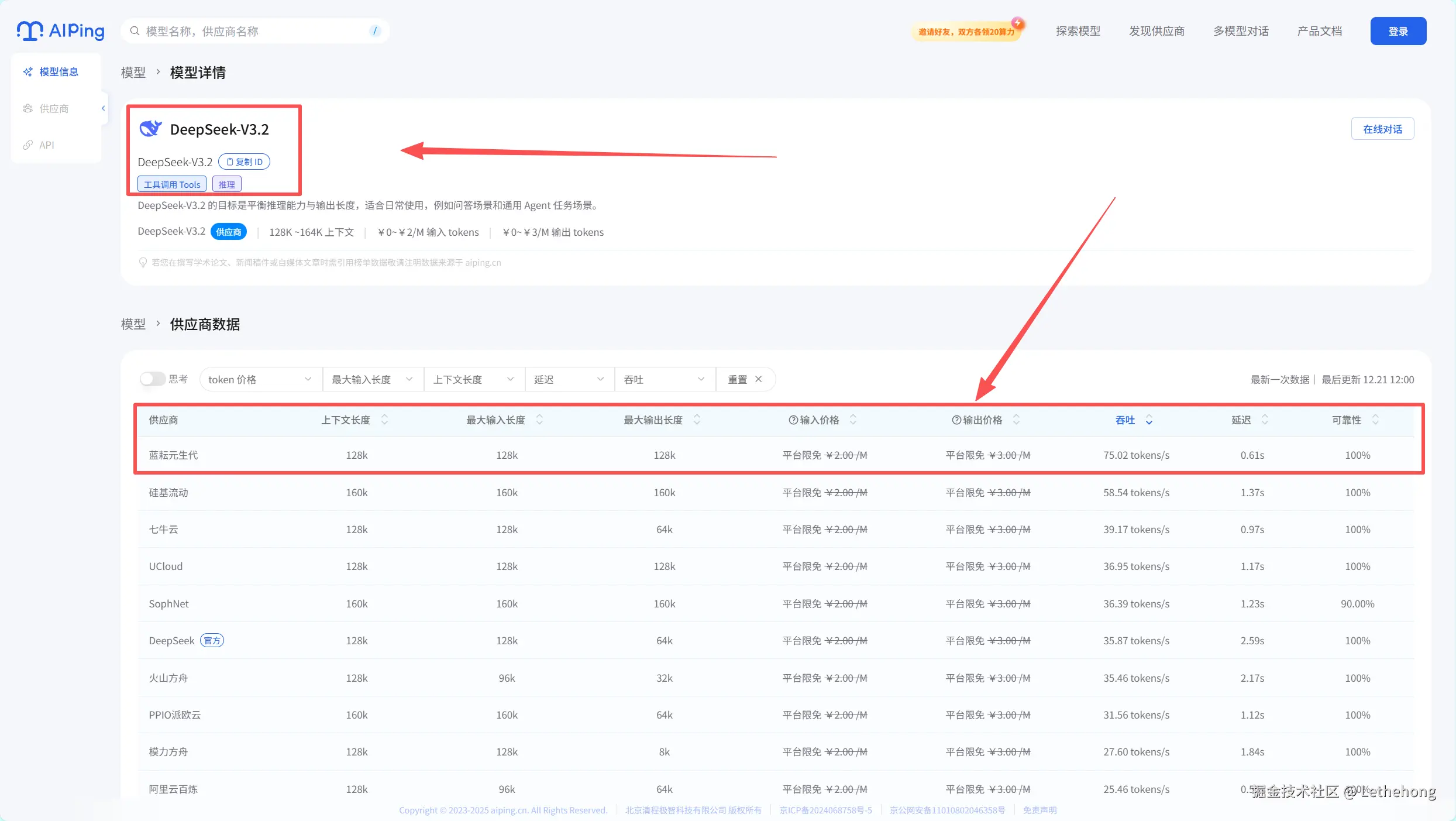 - **蓝耘元生代****:**作为专注于AGI研究的公司,其推出的DeepSeek系列模型始终强调在开源与性能上的突破。DeepSeek-V3.2是其最新版本,明确将自身定位为“平衡推理能力与输出效率”的引擎,旨在为日常问答和通用智能体(Agent)任务提供既强大又迅捷的支持。无论是吞吐还是延迟,均排在首位。