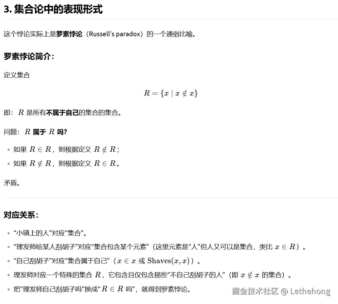未深入探讨集合论中的表现形式或历史背景(如罗素悖论),保持了更贴近原问题的解答风格。