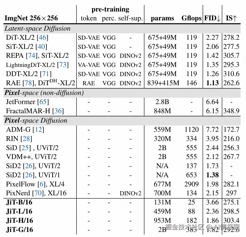 - 对比U-Net:相比于 上一代像素级霸主ADM,JiT展现了Transformer架构的可扩展性优势。 随着计算量的增加,JiT的性能持续提升,而没有出现卷积网络常见的性能饱和。