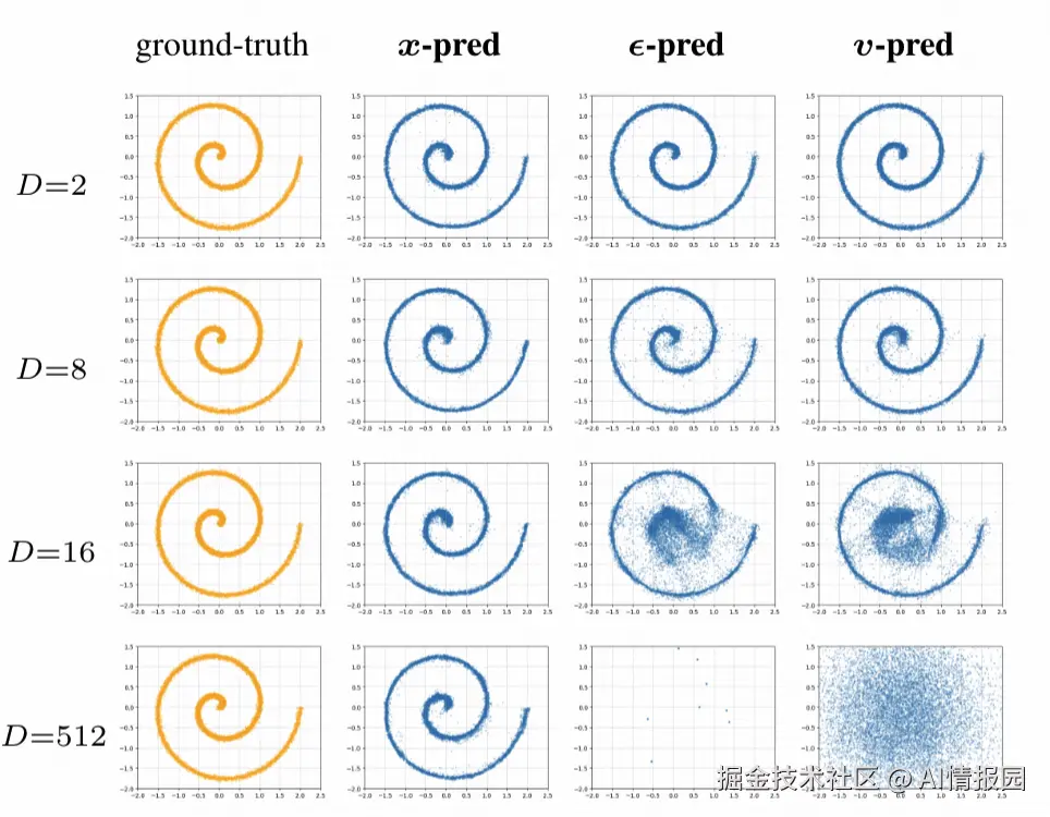 稳健的x-prediction:无论环境维度如何变化,直接预测原图的模型始终能够稳定运行,成功重构了螺旋结构。