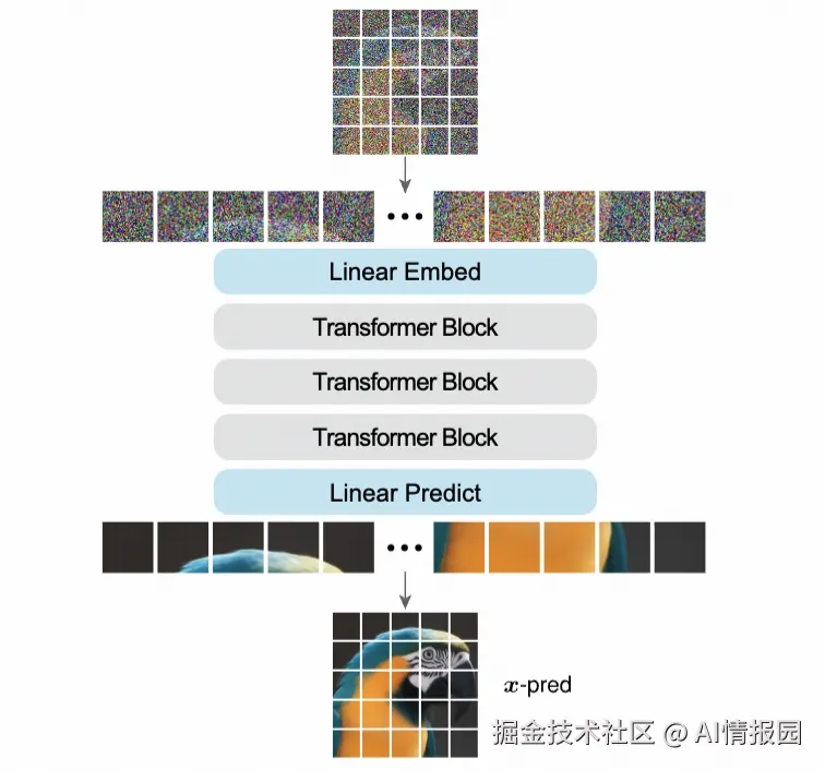 基于上述理论发现,Kaiming He团队提出了一种极简主义的架构—JiT (Just image Transformers)。