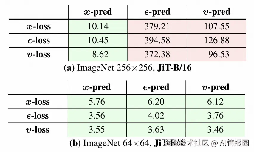 而采用v-prediction的模型表现稍有改善,FID分数徘徊在80左右。 唯一能够显著降低FID的预测目标为x-prediction,其在不做任何架构调整的情况下,成功将FID降至2.97。