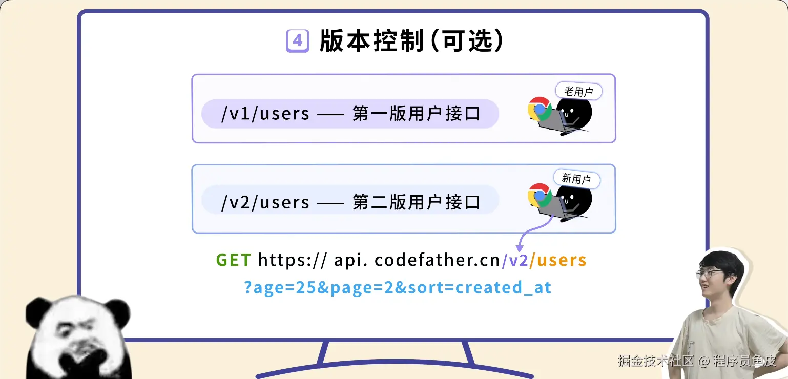 随着业务发展,接口可能需要升级。为了不影响老用户,可以在 URI 中标明版本: