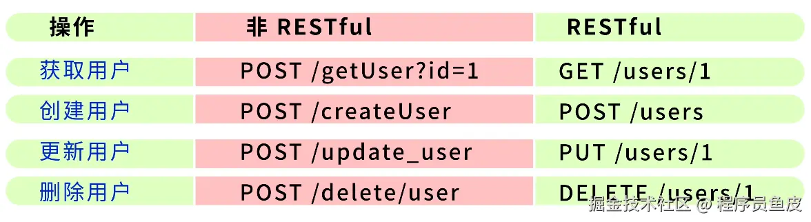 鱼皮:举个例子,比如你要做个用户管理系统,对用户信息进行增删改查,用 RESTful 风格的 API 就长这样: