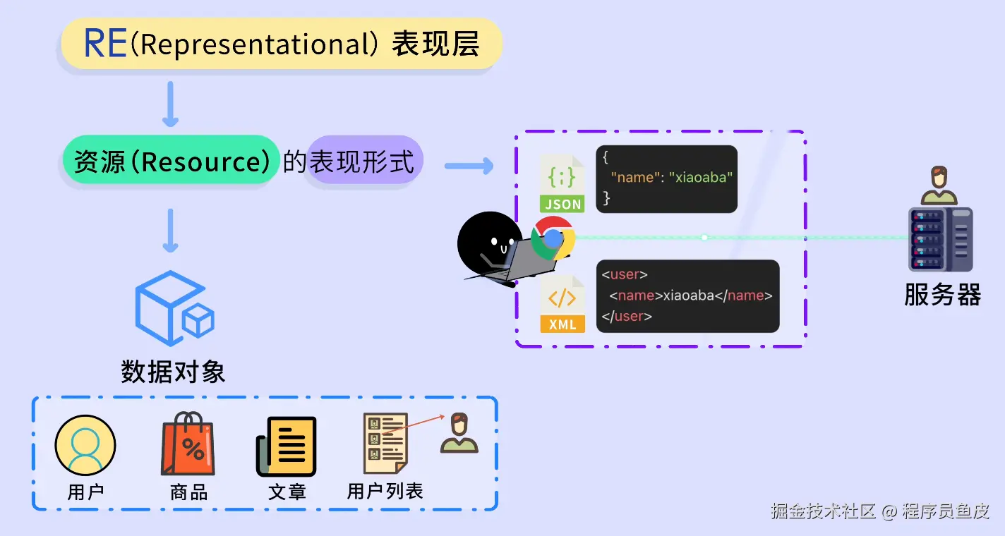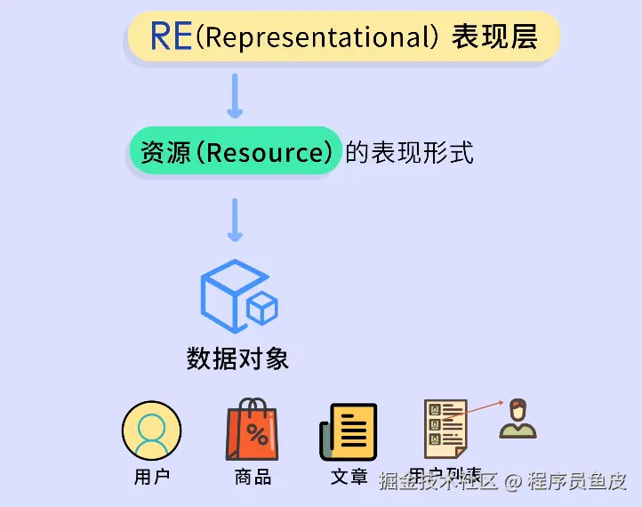 表现层是指资源呈现出来的具体格式,比如同一个用户资源,可以用 JSON 格式返回给客户端,也可以用 XML 格式返回,这就是不同的 “表现形式”。
