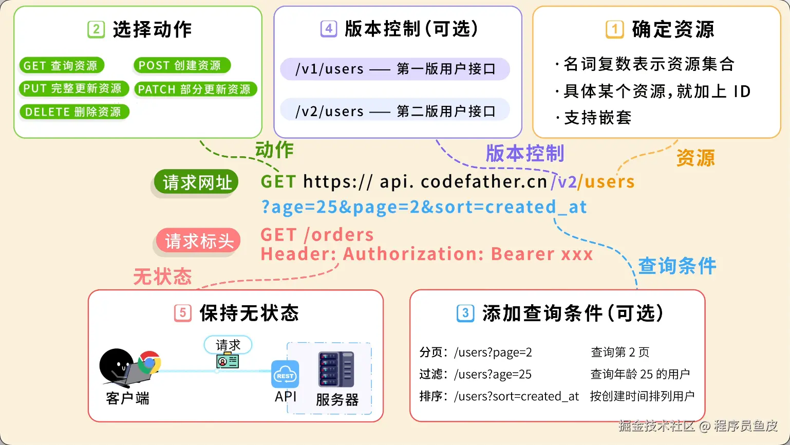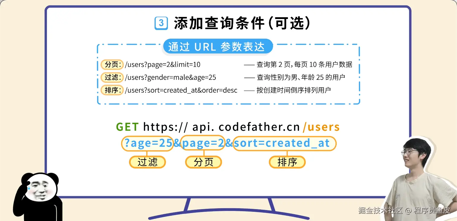 鱼皮:确实,查询参数本身不是 RESTful 特有的。但 RESTful 风格强调 把筛选、排序、分页这些操作,都通过 URL 参数来表达: