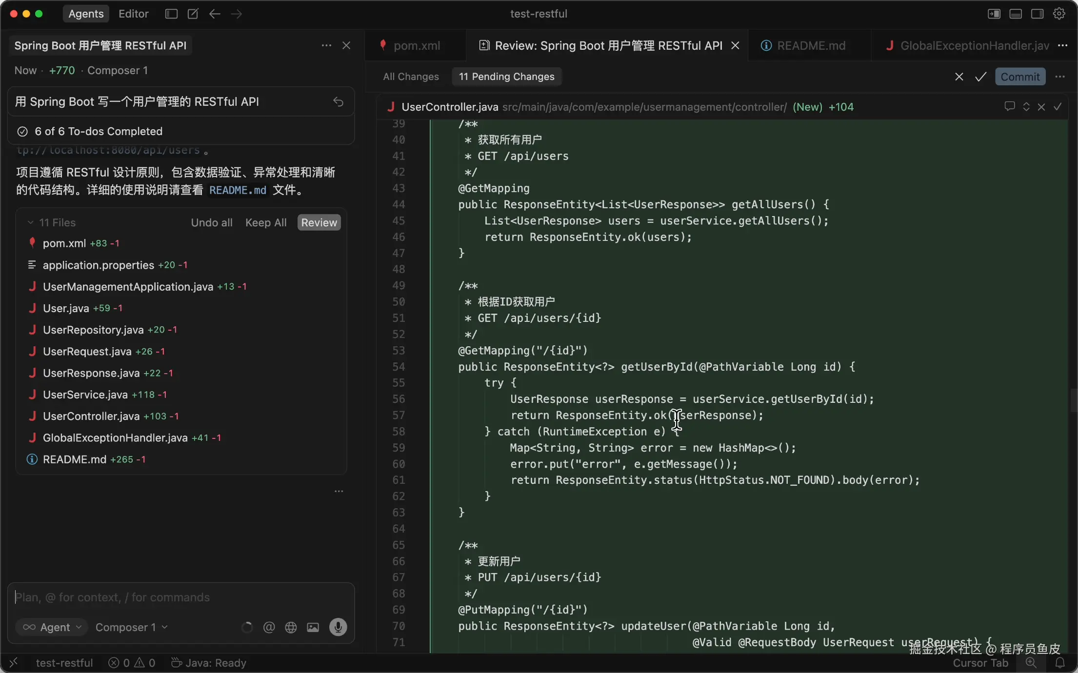 比如直接让 Cursor 帮你用 Spring Boot 写一个用户管理的 RESTful API: