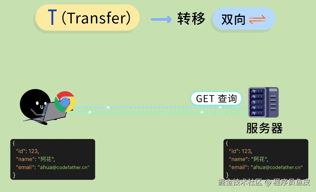 1)当你用 GET 请求时,服务器把资源的状态(比如用户信息的 JSON 数据)转移给客户端。