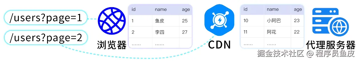 这样一来,URL 更清晰,而且浏览器、CDN、代理服务器都能直接根据 URL 来缓存响应结果。比如 /users?page=1 和 /users?page=2 是两个不同的 URL,可以分别缓存。但如果把参数放在请求体里,URL 都是 /users,缓存就没法区分了。
