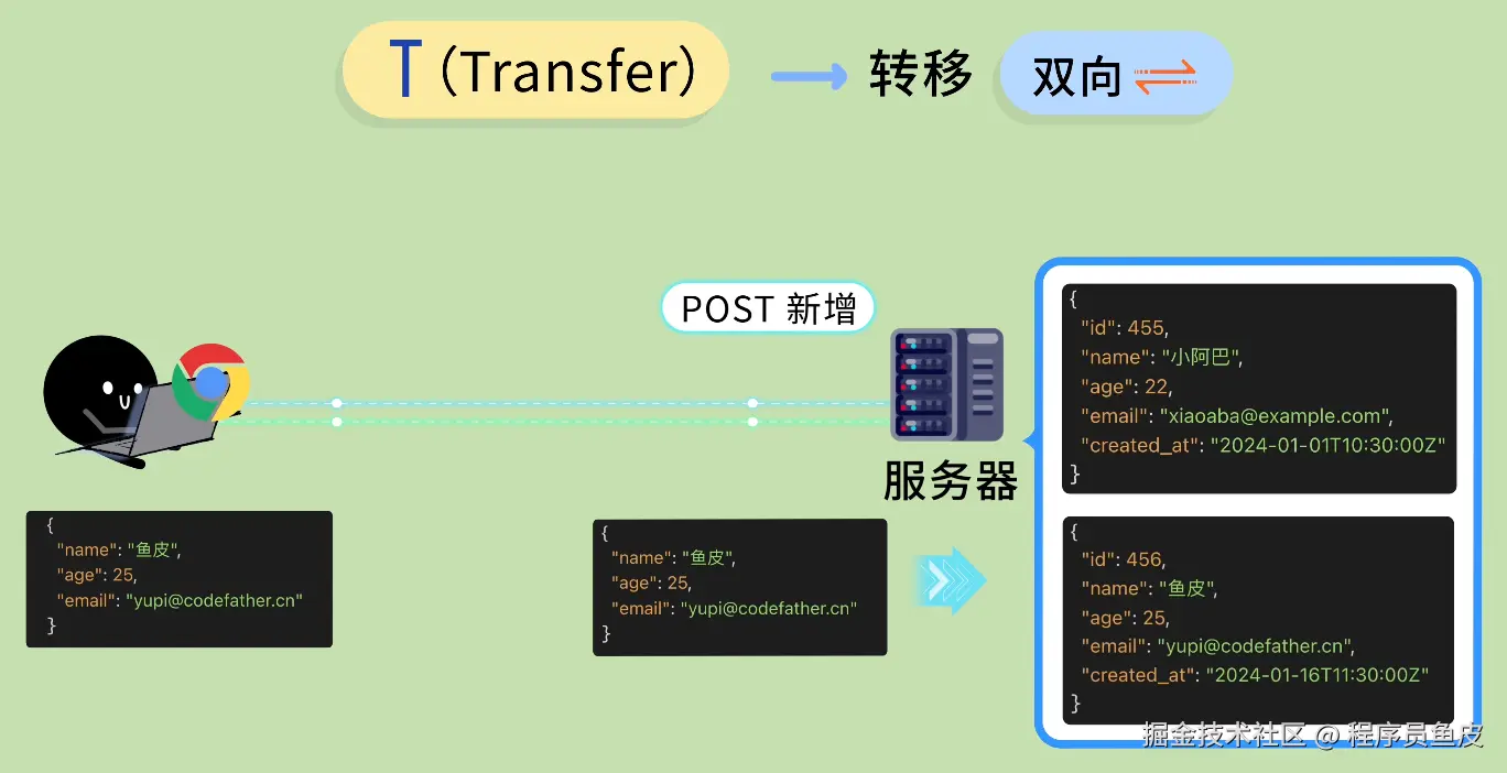 2)当你用 POST/PUT 请求时,客户端把资源的新状态(比如新用户的信息)转移给服务器,从而改变服务器上资源的状态。