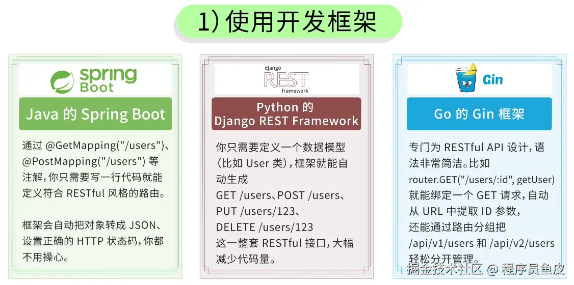 几乎所有主流开发框架都支持 RESTful API 的开发,它们能帮你自动处理很多细节,比如: