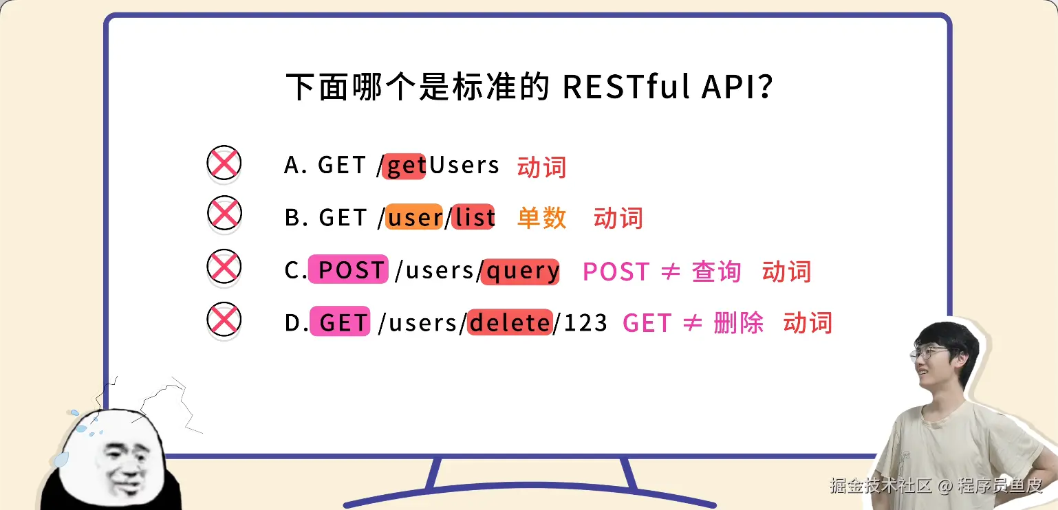 鱼皮:那我来考考你,下面哪个是标准的 RESTful API?