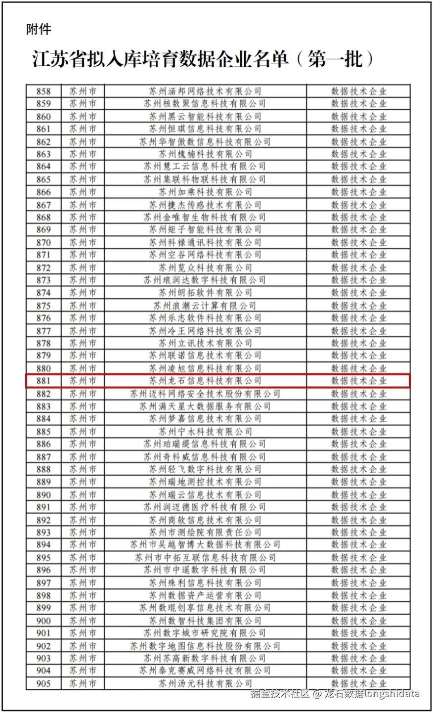 经过企业自主申报、地市数据主管部门初审、省级复审及公示等严格程序,苏州龙石信息科技有限公司(简称:龙石数据)凭借在数据技术领域的扎实积累与突出实力,成功入选江苏省首批入库培育企业行列。