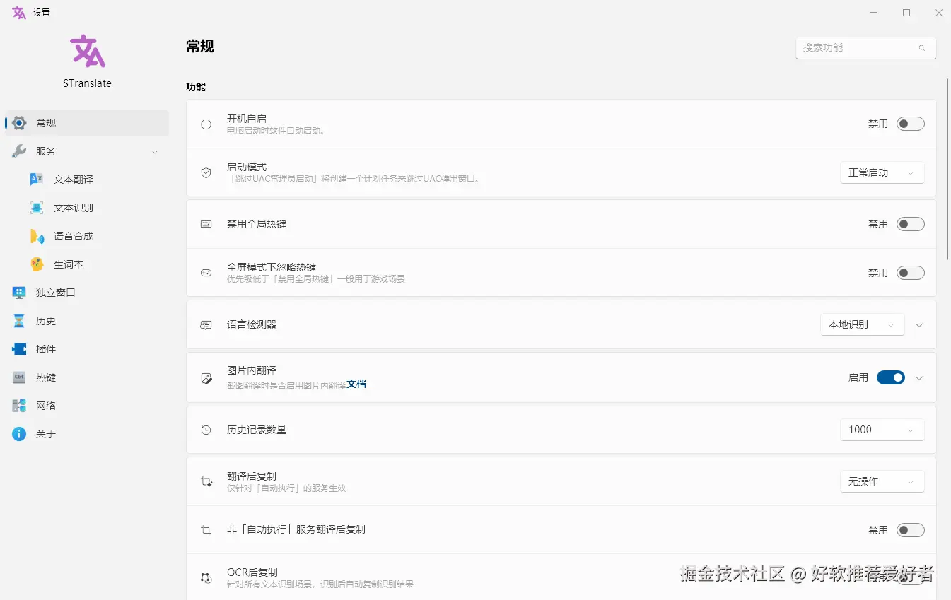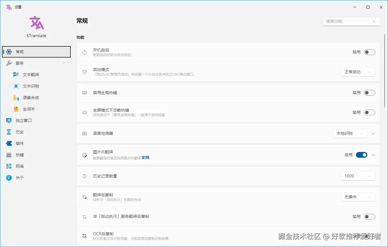 - 服务配置:可自由开启或关闭翻译服务、OCR 服务、语音服务,还支持连通性测试,确保服务正常运行。