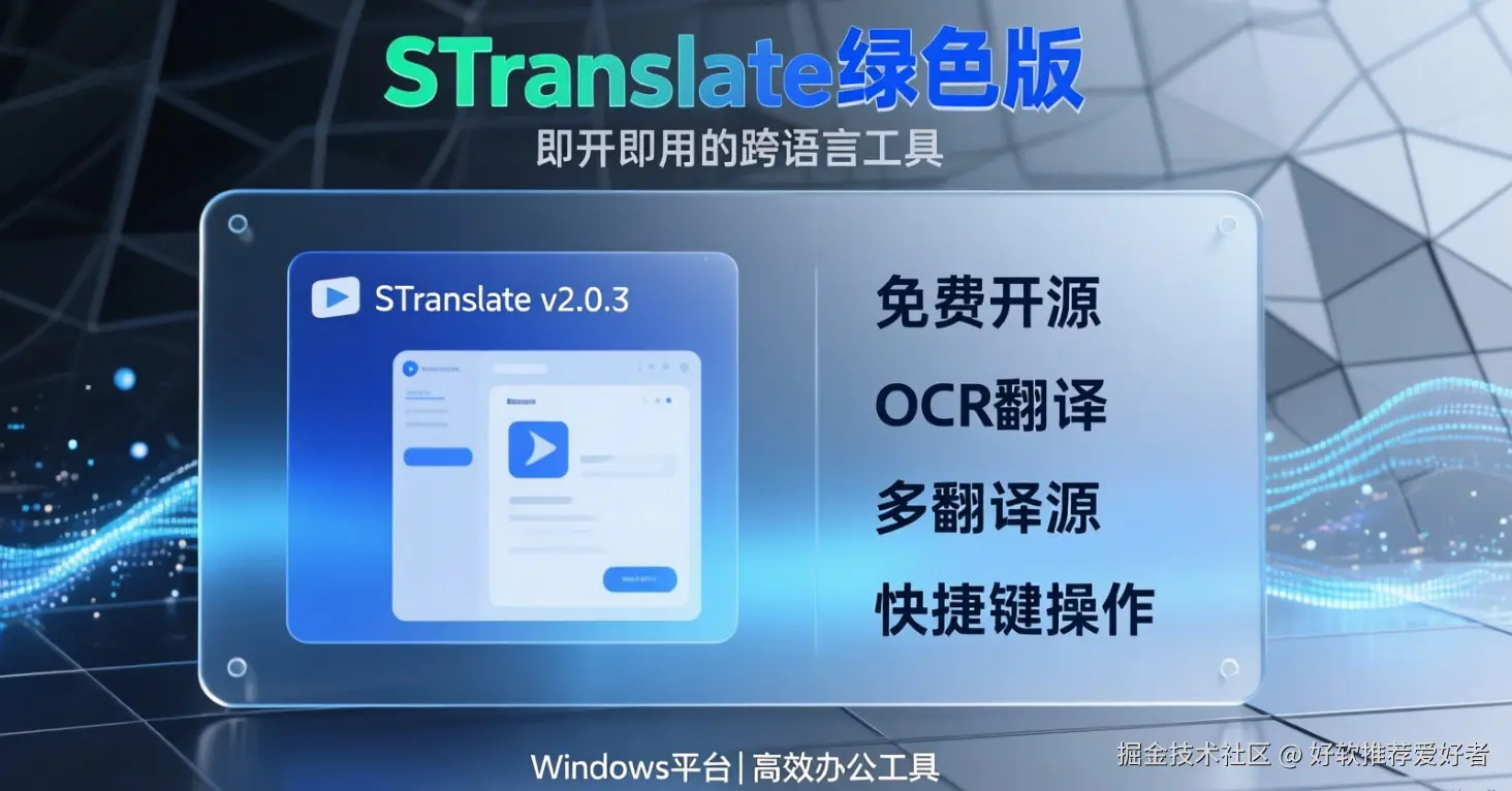 STranslate v2.0.3 绿色版是一款专为 Windows 用户打造的免费开源 OCR 翻译工具,秉持 “即开即用、即用即走” 的核心理念,主打多场景翻译与精准 OCR 识别功能,支持多翻译源切换与快捷键操作,无需复杂安装即可快速处理外文资料、屏幕文字等需求,是跨语言沟通与高效办公的实用工具。