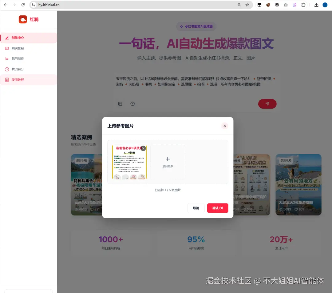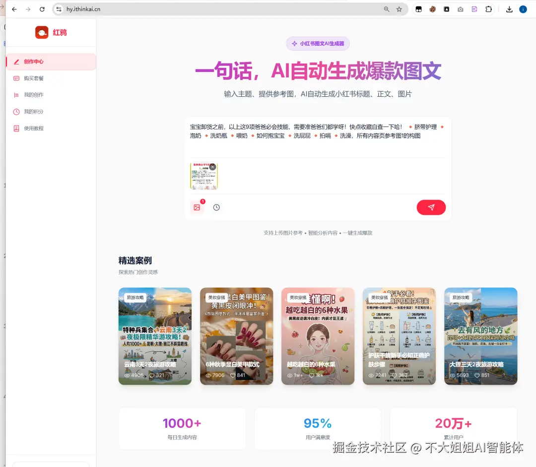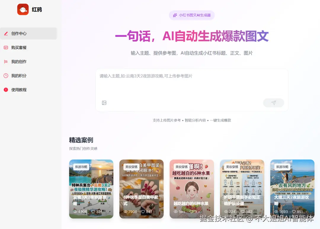 只需输入一个简单的主题(甚至可以扔一张参考图给它),红鸦AI就会像一个资深小红书运营一样,自动为你拆解出最吸睛的爆款标题、极具情绪价值的正文,以及整整 9 张符合小红书审美的配图描述。