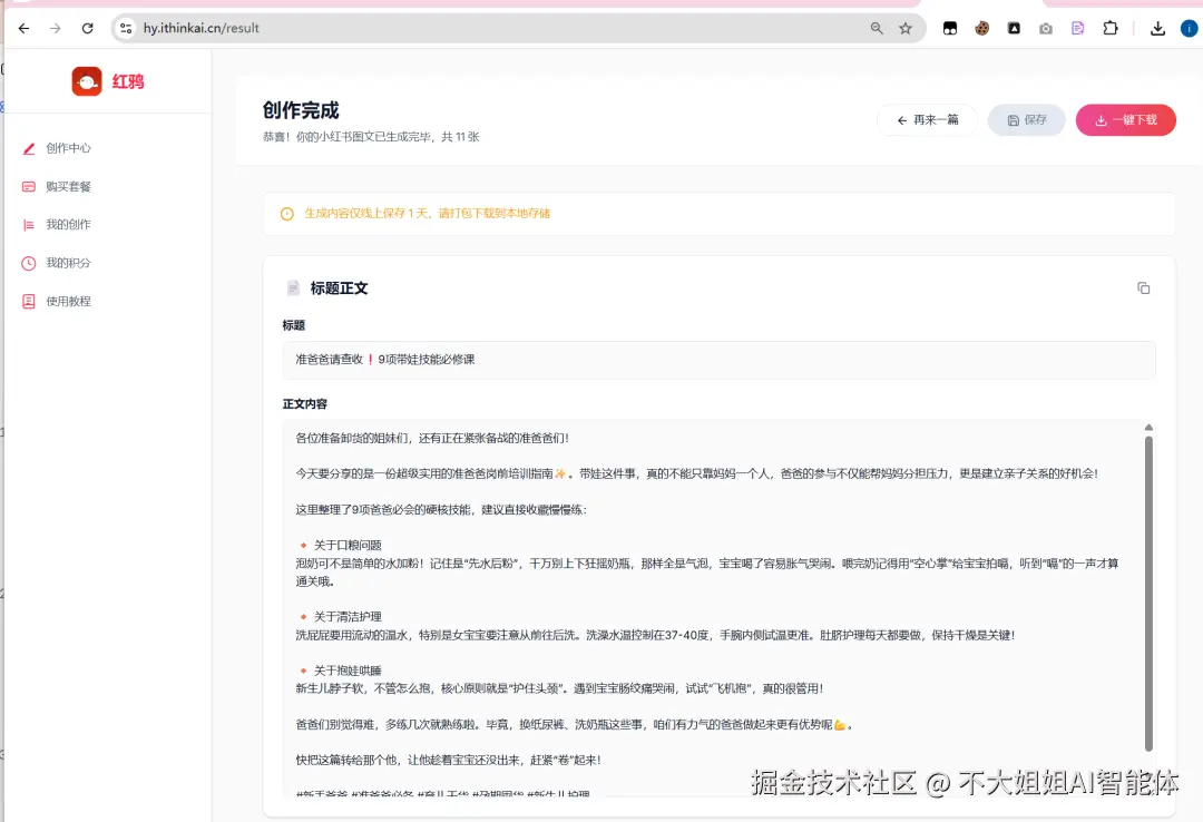 不满意?改下描述词,一键重绘。 整个过程不到 3 分钟,一篇高质量、纯原创的小红书图文就出炉了。