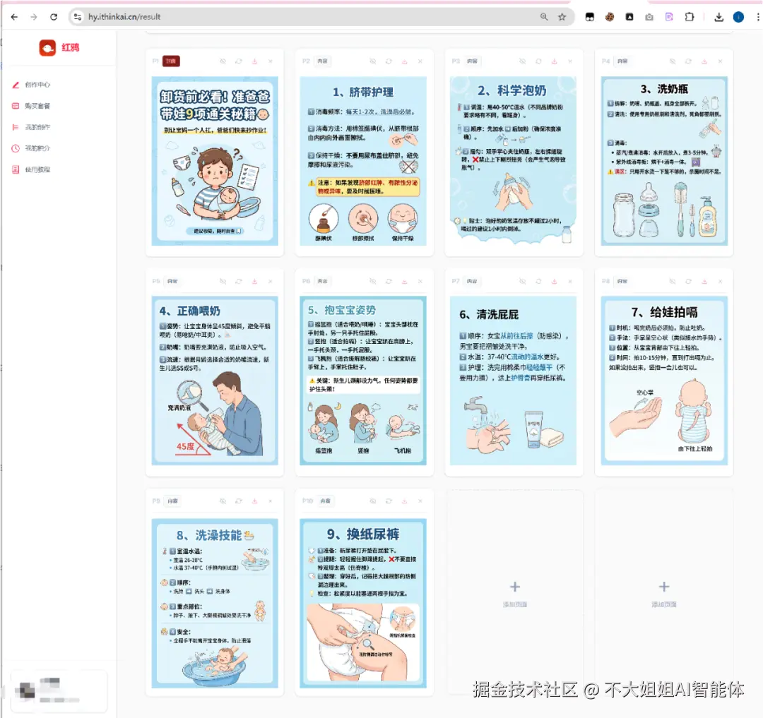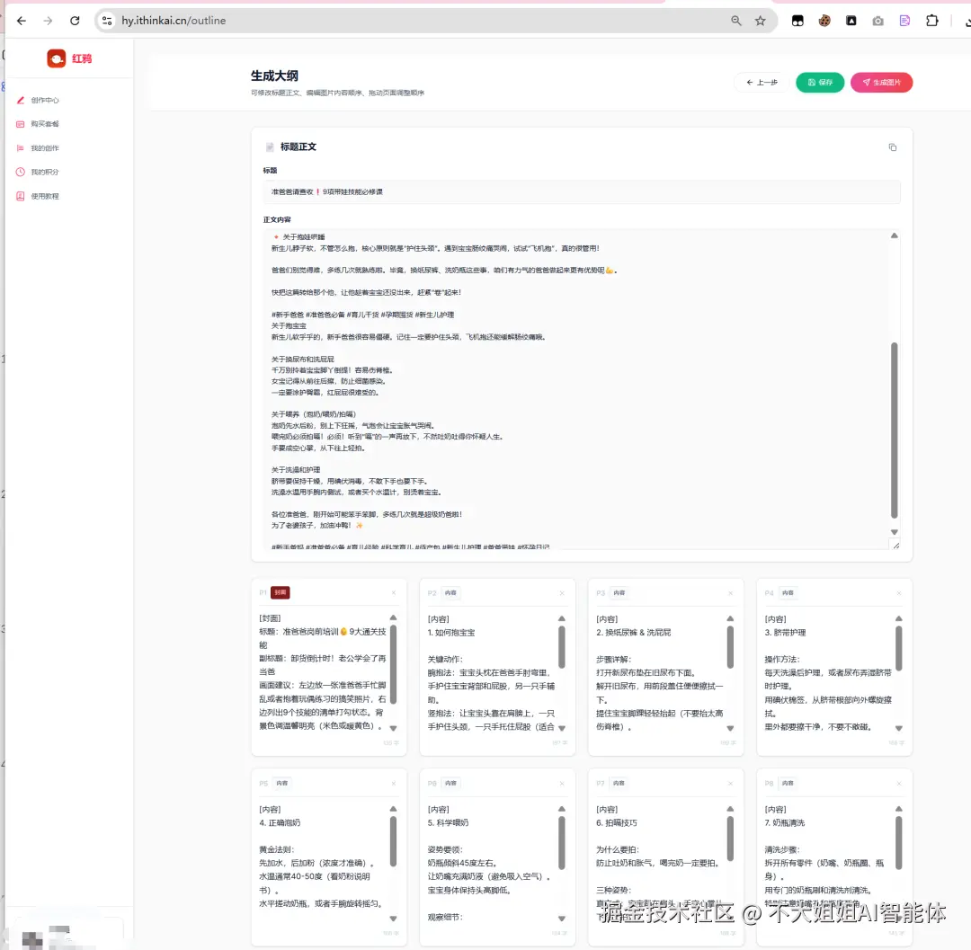 第一步,生成大纲:AI提供标题、正文 + 多张图片的内容描述(文案+配图详解)。编辑超灵活——修改任何部分、调整排版、随意添加图片页面。