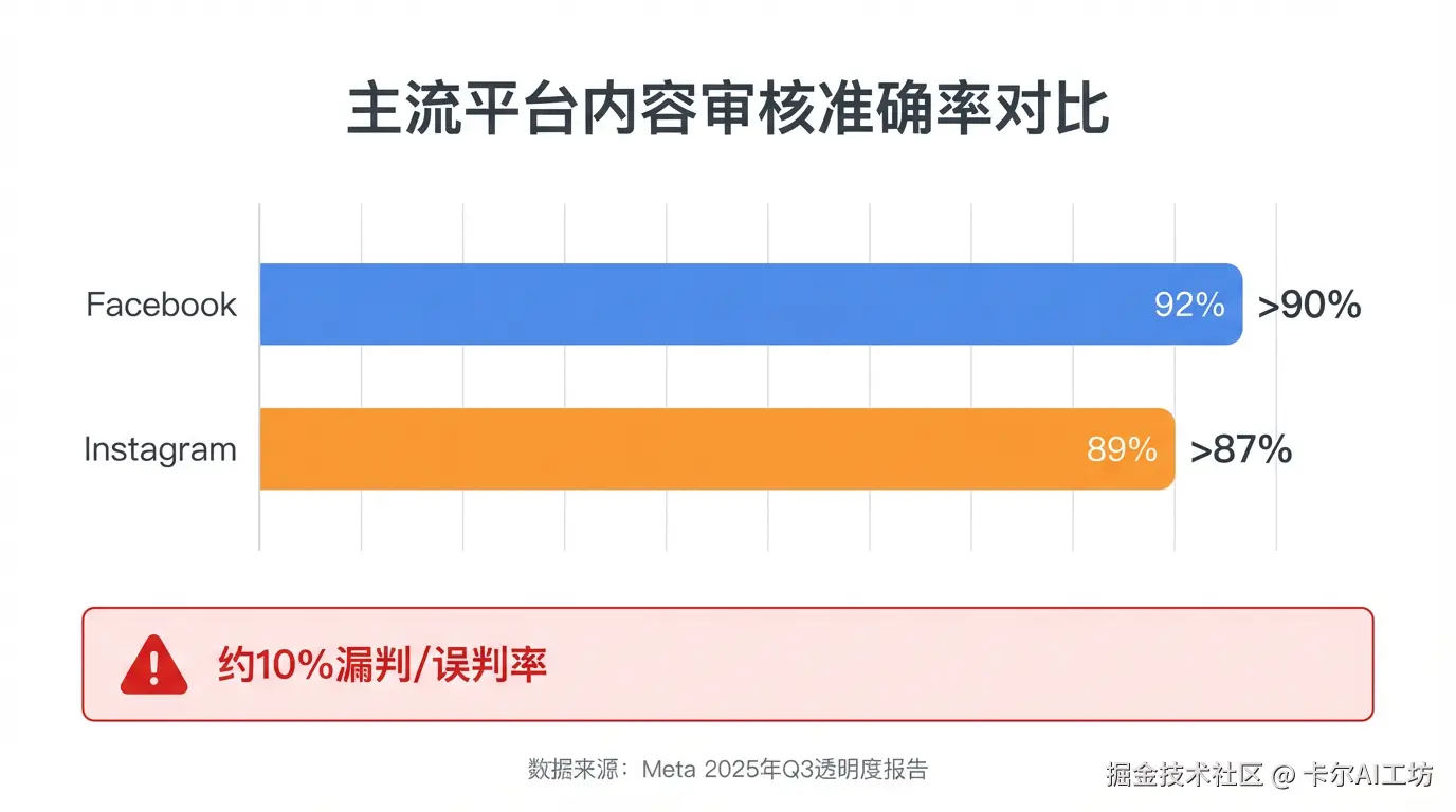 Meta在2025年Q3透明度报告中给出了一个参考数字:Facebook的内容审核执行精确度超过90% ,Instagram超过87% 。听起来很高,但换个角度想——10%的漏判或误判,在每天数千亿条内容的规模下,是一个巨大的数字。