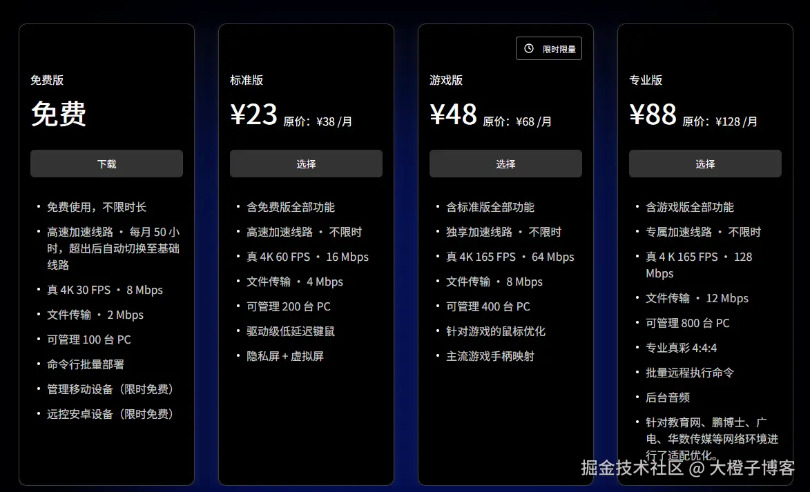 界面仿照多款做的,信息简洁,操作直观;帧率画质是最高支持4K分辨率下165帧。但是易用度和功能丰富度都不占优势,这种名不见经传的小团队的远控收费赶上大厂价,给人体验不稳妥,万一货不对板或经营不善,或许这钱也就白花了。