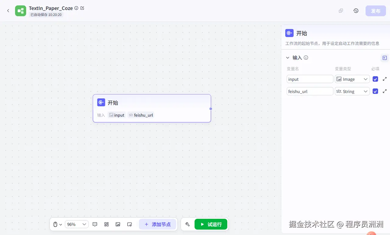 然后创建开始节点,开始节点中需要配置两个输入变量,我这里设置的是image类型的论文图片input,还有飞书的文档链接URL,飞书的文档URL后续解析完成之后的写入过程需要用到。