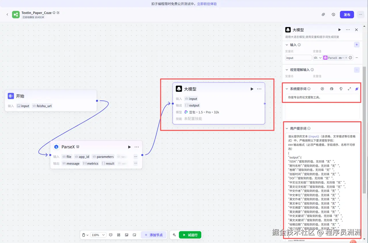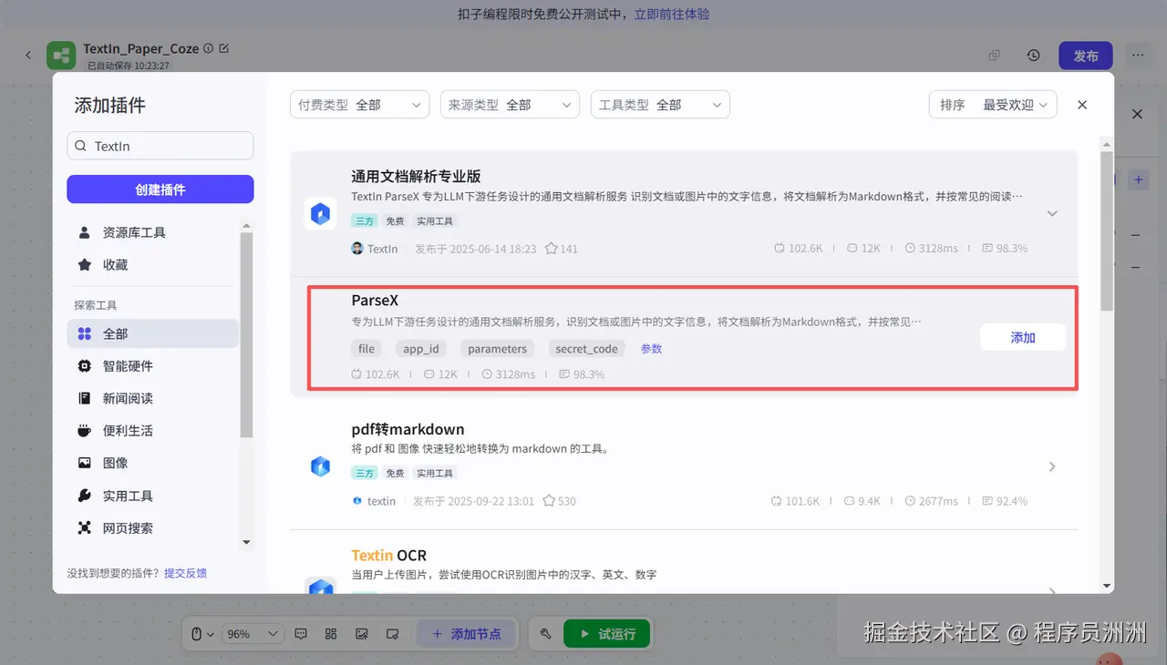 - Coze 流程设计:新建工作流,添加 “TextIn 文档解析” 插件,配置论文上传入口(支持单篇 / 批量上传)。