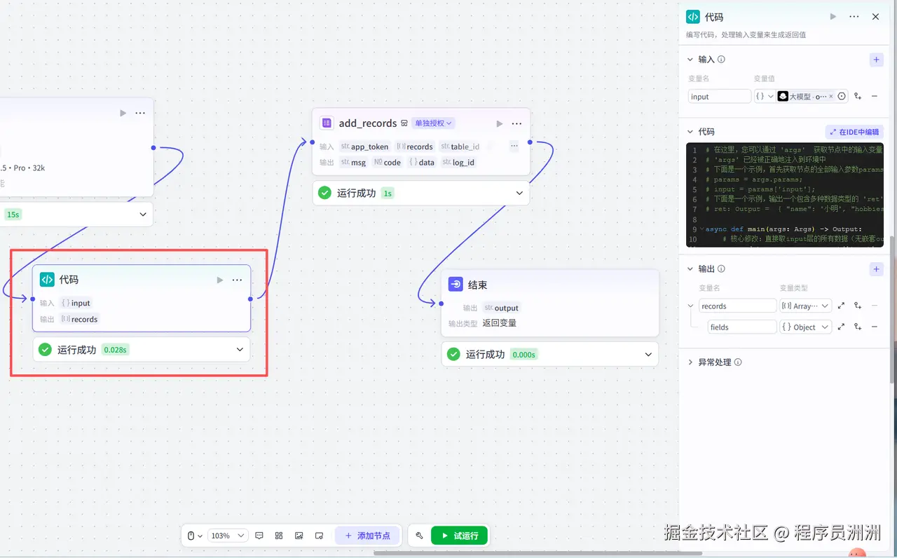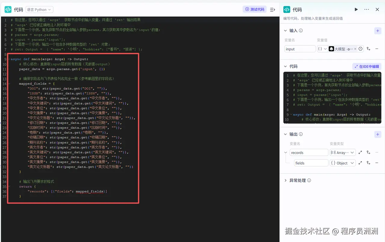 再接下来就是添加代码节点,代码节点的作用是获取大模型的格式化输出,设别嵌套的数据,然后进行对应的飞书字段映射,为后续写入飞书文档做铺垫。