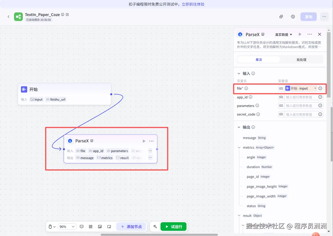 添加之后我们将开始节点和ParseX节点串联起来,然后设置ParseX对应的输入为图片,这样就可以识别到输入的论文了。