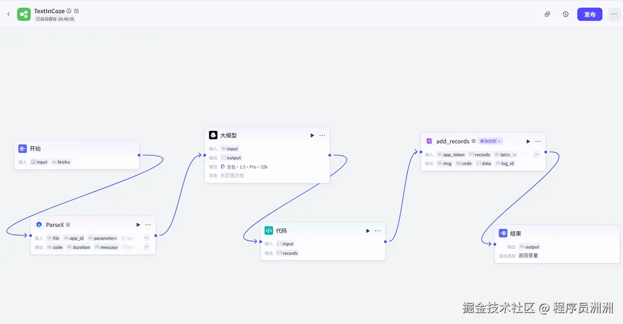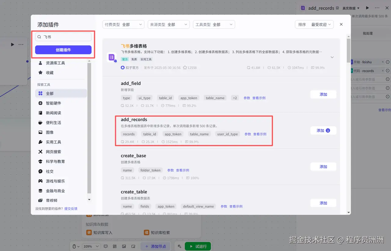 最后我们添加飞书多维表格插件节点,授权对应的飞书账号之后,配置输入与输出,工作流就基本大功告成了!