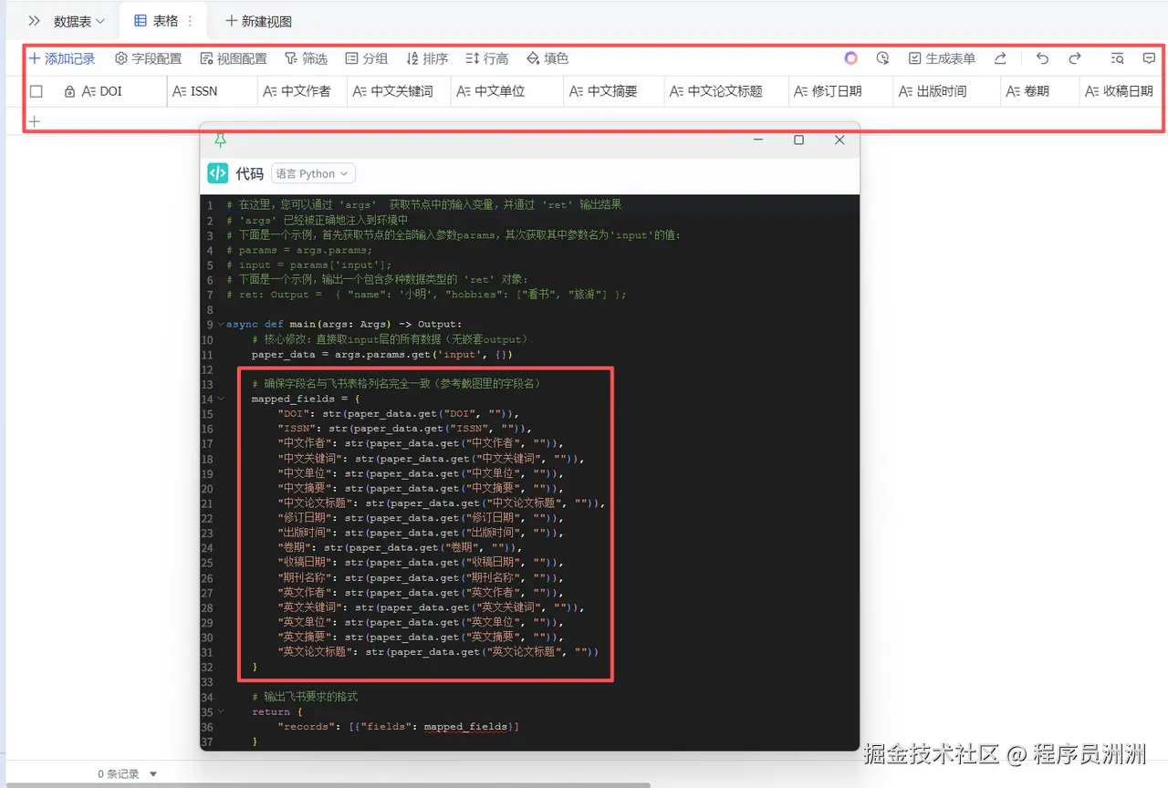 首先在飞书文档创建对应的表格,创建需要的表格列,注意列名需要跟刚刚我们的飞书添加数据节点中的Python代码中的对应列名要对应上,比如下图所示。