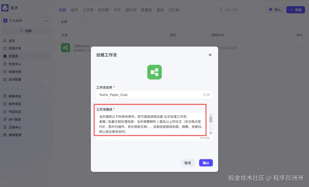 - 飞书表格输出:添加 “飞书表格” 插件,映射解析字段(论文标题→A 列、论文关键词→B 列等)。 首先我们点击Coze创建工作流,然后进行直观的工作流描述,这样如果后面有搭建Agent智能体的需求,可以让智能体知道在什么场景下调用该工作流。