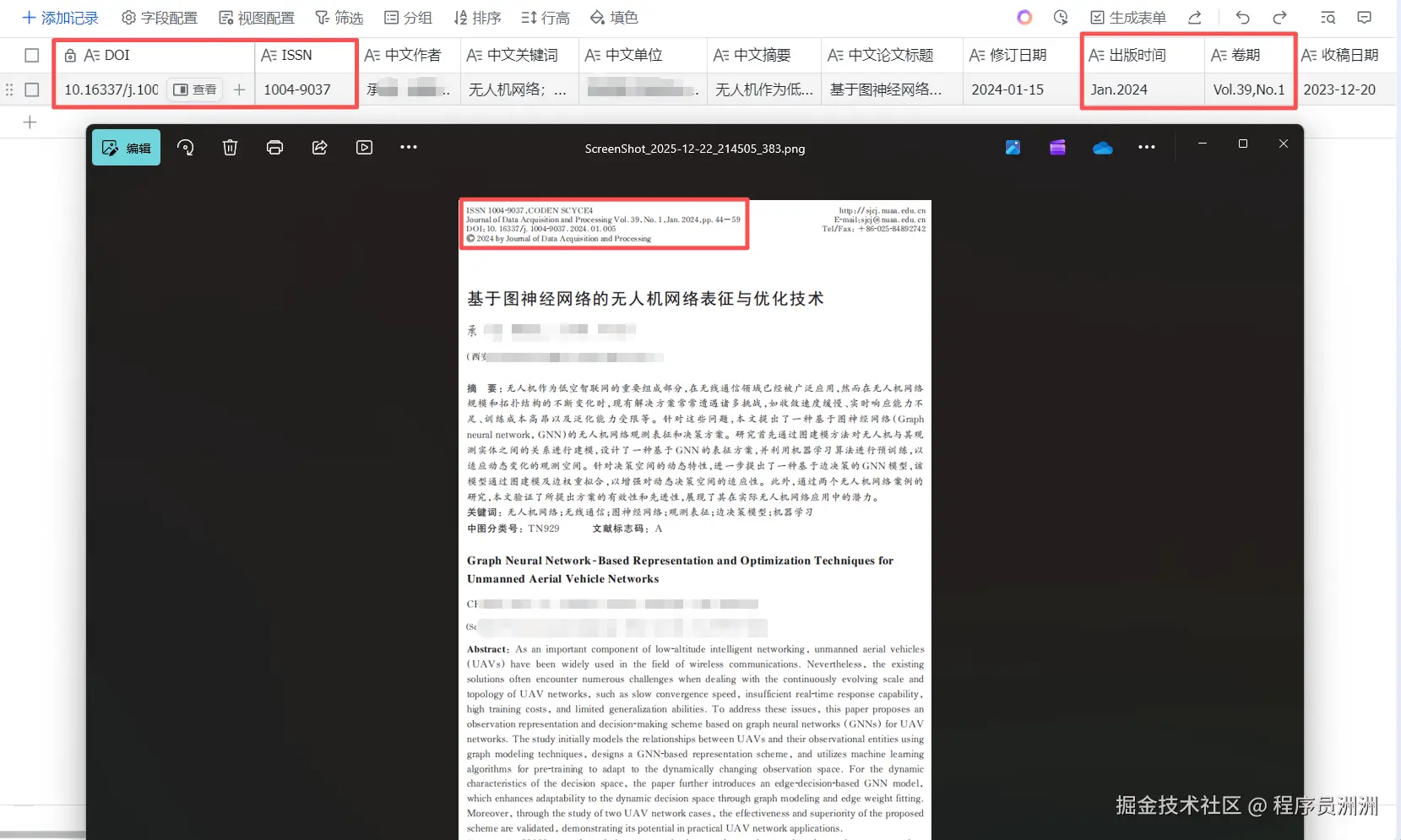 我们再打开飞书文档,就可以看到已经自动帮我们新增好对应的数据了。准确率我核对了一下,百分百正确,比如图中的左上角的很小的ISSN号,是完全能够对得上的,这一点也印证了ParseX的功能强大之处,而且效率很高,比人为手动的去挨个复制添加好很多。