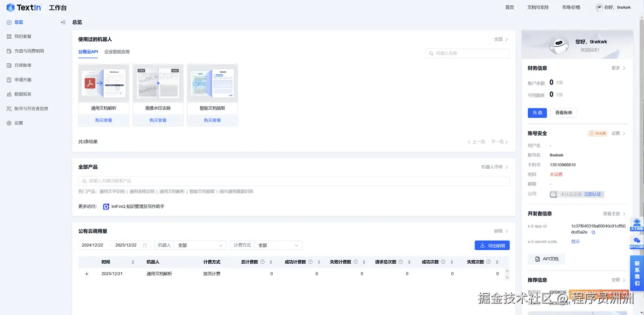 然后登录合合信息的TextIn工作台平台(www.textin.com/register/co… 。可以根据需要体验一下TextIn的各类产品,比如当前比较热门的通用文字识别、通用文档解析等,这些也是待会我们要在Coze平台中要引入的插件功能。